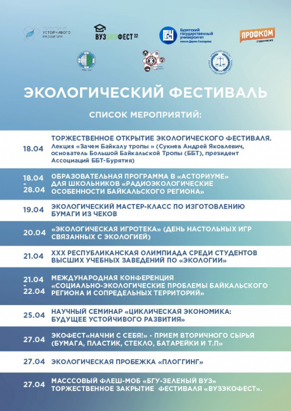 Приглашаем вас принять участие в экологическом фестивале Бурятского государственного университета. Он будет длиться с 18 по 27 апреля.