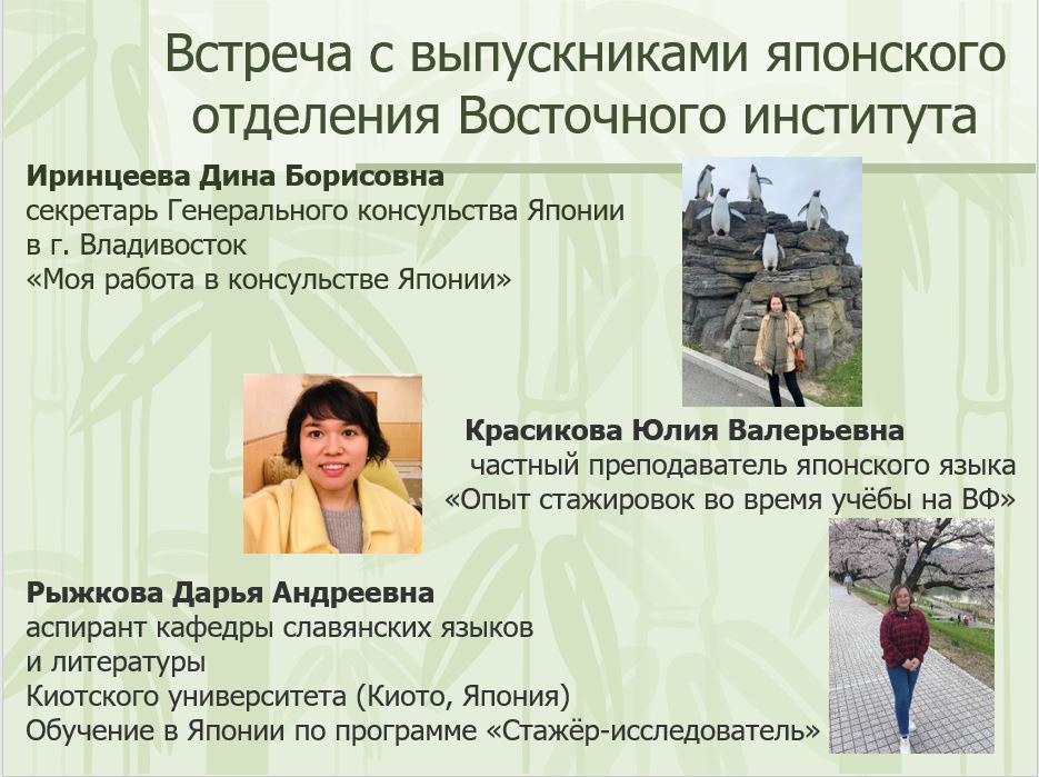Неделя японского языка началась с онлайн-встречи с выпускниками японского отделения ВИ Иринцеевой Диной, Рыжковой Дарьей и Красиковой Юлией. Выпускники рассказали о своем опыте участия в грантах МЕХТ, учебе в Японии и о своей работе. В течение недели также проводились различные викторины, конкурсы по языку и культуре Японии, мастер-классы по японской кухне. Заключительным этапом стало награждение участников Недели японского языка и просмотр увлекательного аниме.