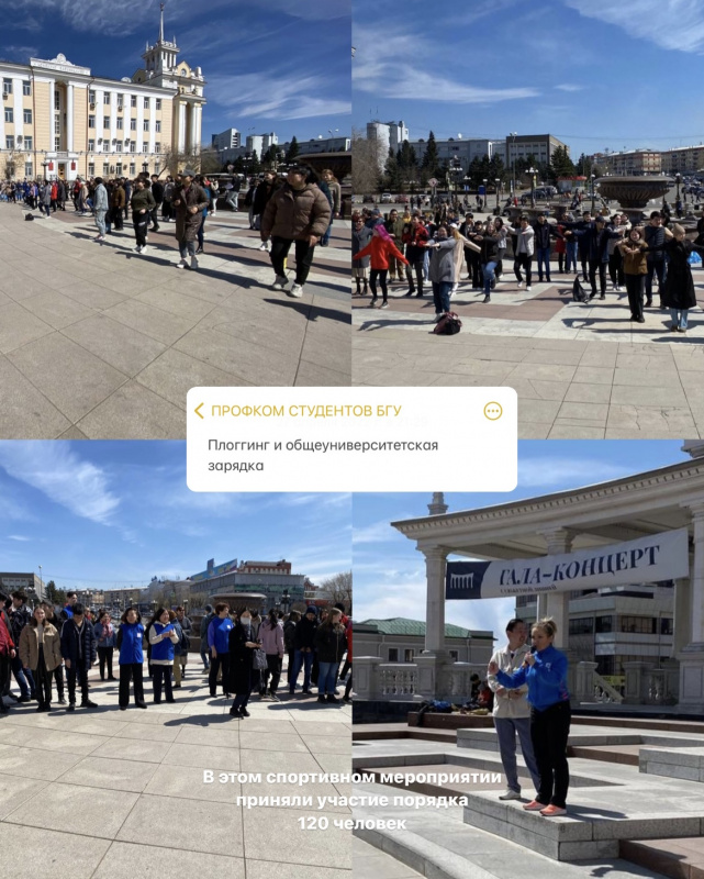 27 апреля в 11:00 около семидесяти человек приняло участие в плоггинге. Его завершением стала зарядка на театральной площади возле 8 корпуса БГУ, которую провела начальник отдела социальной работы Ольга Анатольевна Куликова. В зарядке участвовали студенты и преподаватели ФБГиЗ, ХФ, ЮФ, Колледжа и СПФ, всего в этом спортивном мероприятии приняло участие порядка 120 человек.