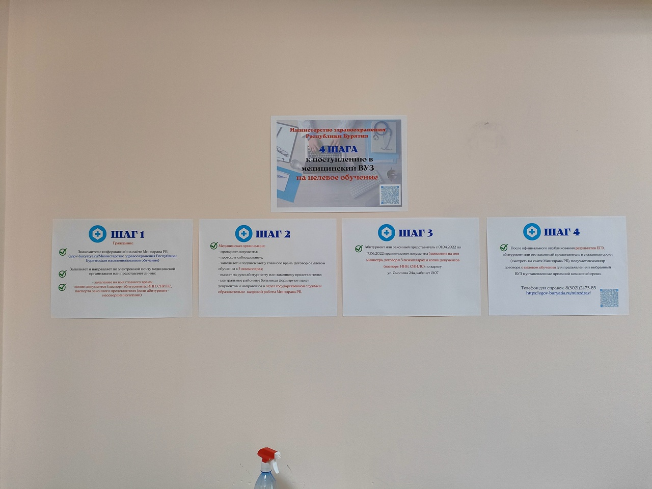 В кабинете размещена вся необходимая информация для будущих студентов, а специалист Минздрава РБ по целевому набору сможет ответить на все интересующие абитуриентов вопросы.