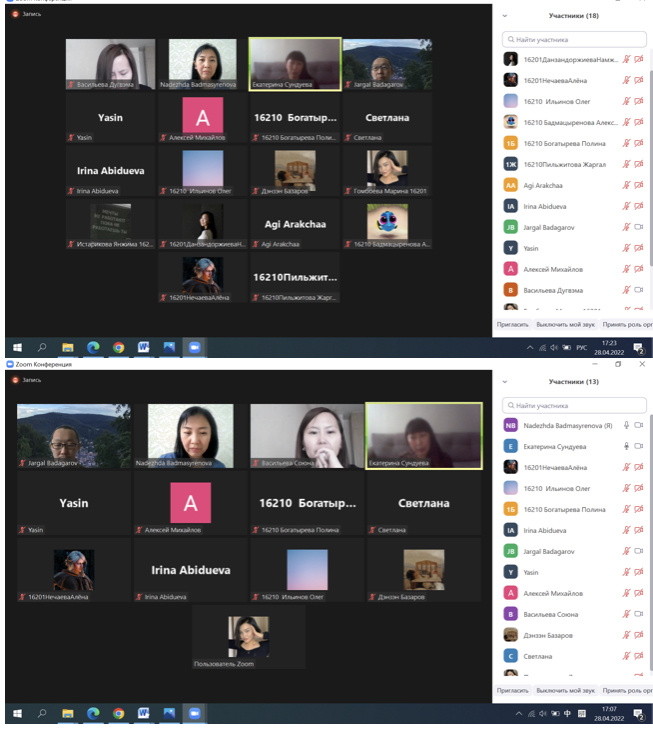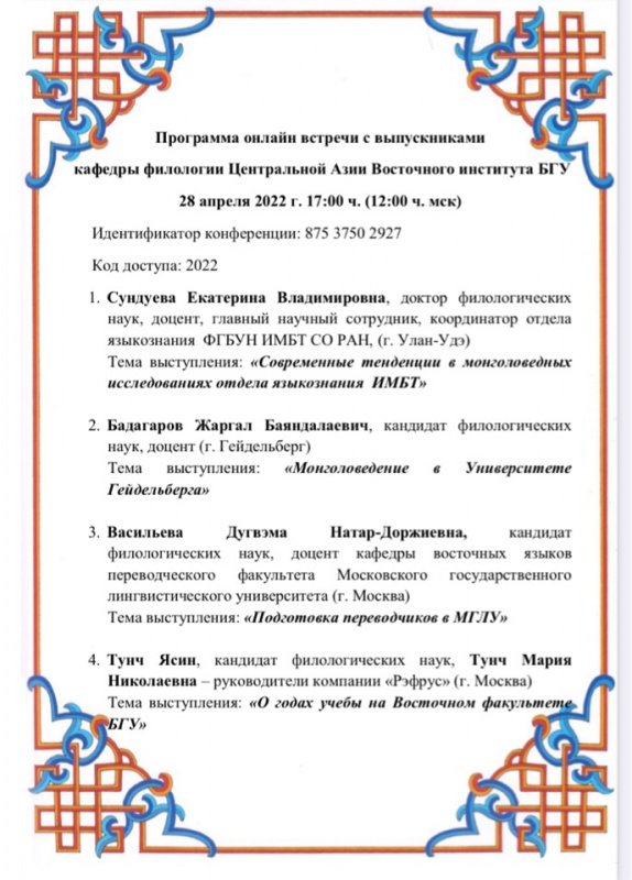 В рамках Недели монгольского языка состоялось заседание секции «Актуальные вопросы филологии Центральной Азии» ЕСНПК, на которой было заслушано 23 студенческих доклада. В продолжение Дня монгольской науки в режиме видеоконференции была организована профориентационная встреча с успешными выпускниками кафедры разных лет: Сундуевой Екатериной Владимировной, доктором филологических наук, доцентом, главным научным сотрудником, координатором отдела языкознания ФГБУН ИМБТ СО РАН, которая рассказала о современных тенденциях в монголоведных исследованиях отдела языкознания ИМБТ, Бадагаровым Жаргалом Баяндалаевичем, кандидатом филологических наук, доцентом, преподавателем монгольского языка Гейдельбергского университета имени Рупрехта и Карла (Германия) и Венского университета (Австрия), чье выступление было посвящено востоковедению в Университете Гейдельберга, Васильевой Дугвэмой Натар-Доржиевной, кандидатом филологических наук, доцентом кафедры восточных языков переводческого факультета Московского государственного лингвистического университета, представившей выступление на тему подготовки переводчиков в МГЛУ. Закрывал встречу Тунч Ясин, кандидат филологических наук, руководитель компании «Рэфрус», который рассказал студентам и старшеклассникам о годах учебы на Восточном факультете БГУ.