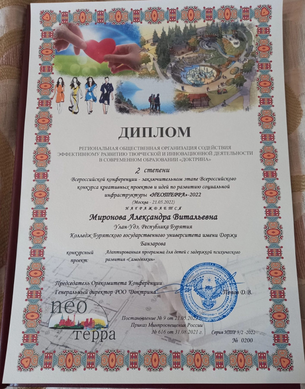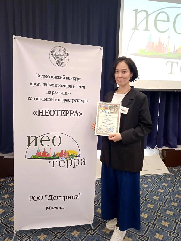 Студентка 4го курса Колледжа БГУ им. Д. Банзарова направления подготовки «Педагогика дополнительного образования» Миронова Александра стала победителем заочного этапа Всероссийского конкурса креативных проектов и идей по развитию социальной инфраструктуры «Неотерра» и была приглашена к участию в очном этапе конкурса, который состоялся 21 мая 2022 в г. Москва.