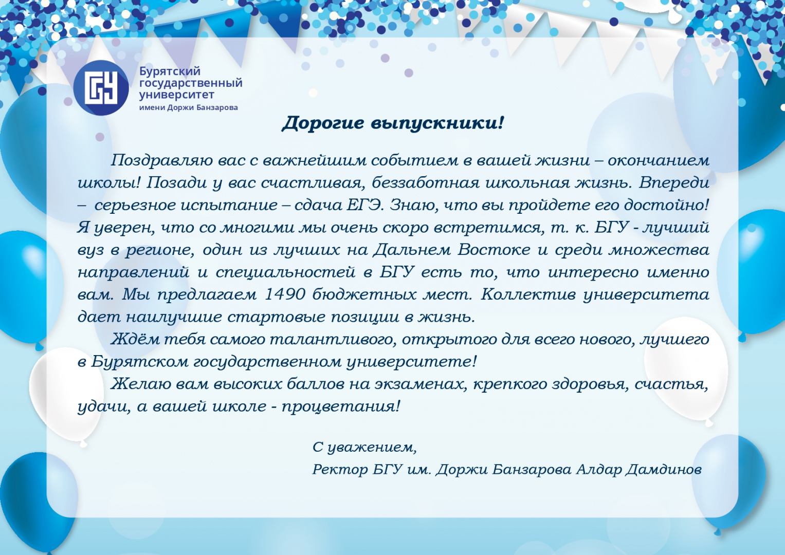 Поздравляю вас с важнейшим событием в вашей жизни - окончанием школы! Позади у вас счастливая, беззаботная школьная жизнь. Впереди - серьезное испытание - сдача ЕГЭ. Знаю, что вы пройдете его достойно! Я уверен, что со многими мы очень скоро встретимся, т. к. БГУ - лучший вуз в регионе, один из лучших на Дальнем Востоке и среди множества направлений и специальностей в БГУ есть то, что интересно именно вам. Мы предлагаем 1490 бюджетных мест. Коллектив университета дает наилучшие стартовые позиции в жизнь.