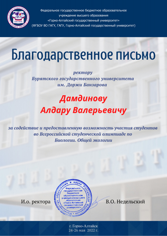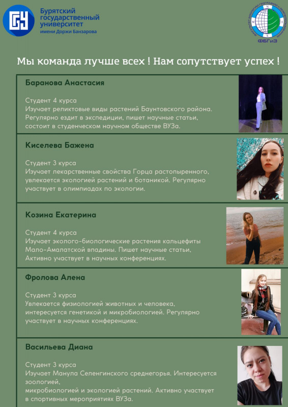 24 – 26 мая 2022 года состоялась Всероссийская студенческая олимпиада по биологии и общей экологии на базе Горно-Алтайского государственного университета, в которой принимала участие команда студентов четвертого и третьего курсов ФБГиЗ: Баранова Анастасия, Козина Екатерина, Киселева Бажена, Васильева Диана.