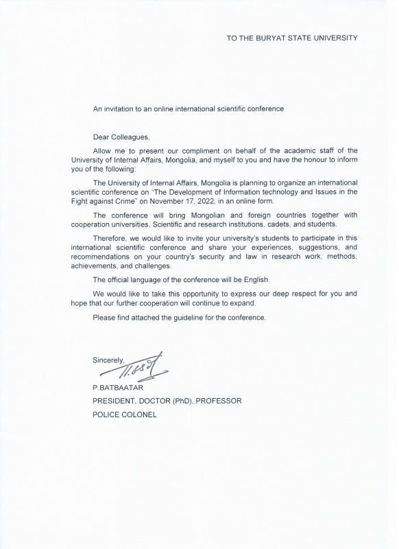 Университет иностранных дел Монголии приглашает студентов принять участие в Международной научной конференции «Развитие информационных технологий и вопросы борьбы с киберпреступностью», которая пройдет 17 ноября 2022 года с 13:00-17:00 в онлайн-формате.