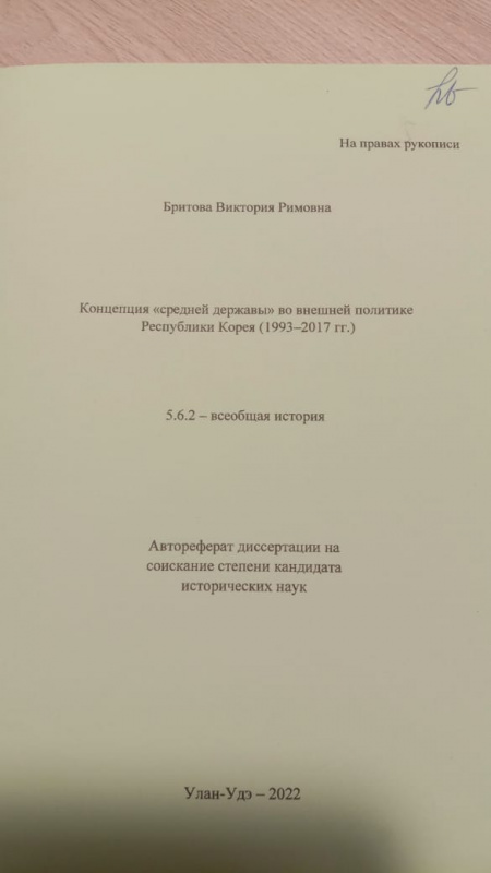 23 сентября 2022 г. в диссертационном совете 24.1.083.01 на базе ИМБТ СО РАН успешно прошла защита диссертации ассистента кафедры филологии стран Дальнего Востока Бритовой Виктории Римовны "Концепция "средней державы" во внешней политике Республики Корея (1993-2017 гг.)", представленной на соискание ученой степени кандидата исторических наук по специальности 5.6.2 - всеобщая история. Научный руководитель - доктор политических наук, доцент, директор Восточного института Владимир Александрович Родионов.