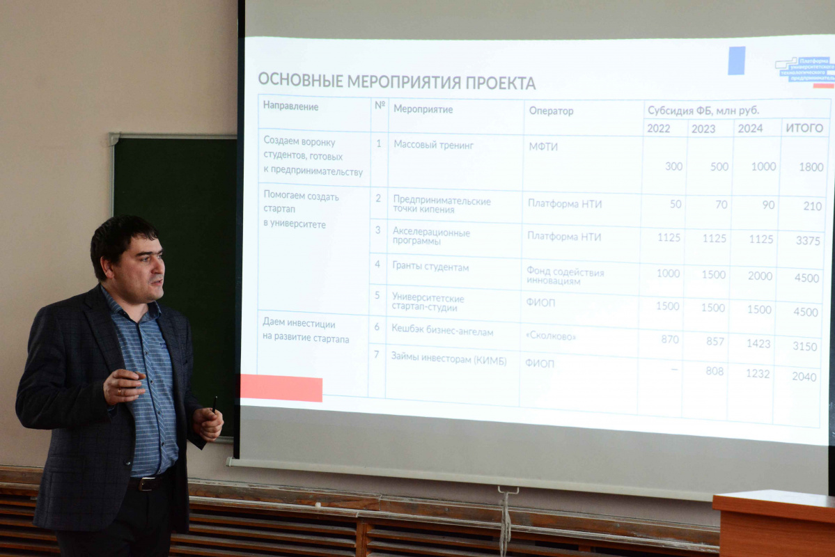 Проректор БГУ по цифровой трансформации и развитию С.В. Архипов рассказал в деталях об гранте на проведение акселератора в федеральном конкурсе в рамках проекта «Платформа университетского технологического предпринимательства», что БГУ получил финансирование в размере свыше 7 млн. рублей, и что дает университету проведение акселератора.