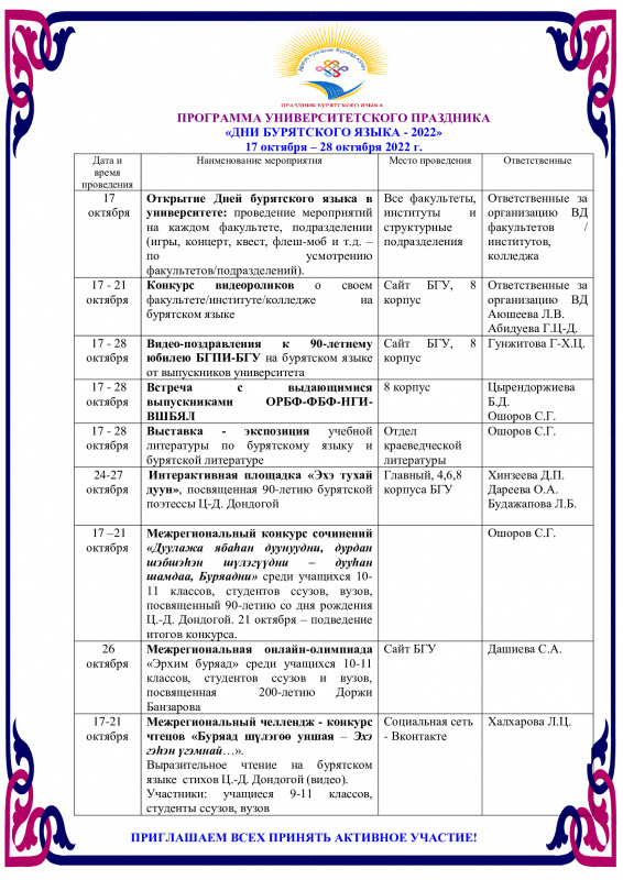 Центр сохранения и развития бурятского языка, кафедра бурятского языка и методики преподавания, кафедра бурятской и эвенкийской филологии приглашают вас принять активное участие в Университетском празднике «Дни бурятского языка», который пройдет с 17 по 28 октября 2022 года.