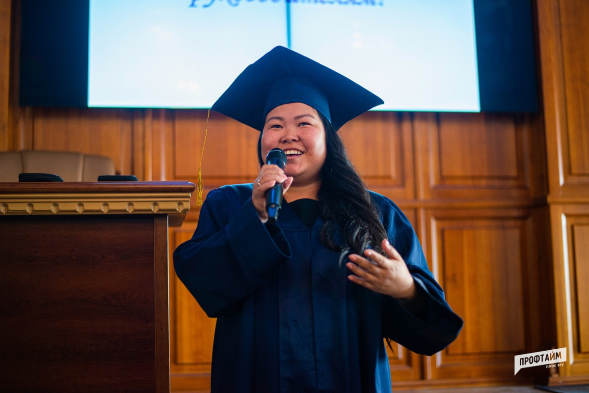 Иностранных аспирантов сердечно поздравила ведущий специалист отдела международных связей, кандидат филологических наук, выпускница аспирантуры БГУ 2019 года Будаева Цындыма Львовна. Она поблагодарила выпускников за выбор нашего университета для получения образования третьего уровня - высшей квалификации, за вклад в развитие российской науки и упрочение международных научных связей. Пожелала аспирантам вернуться уже в качестве приглашенных профессоров, доцентов.