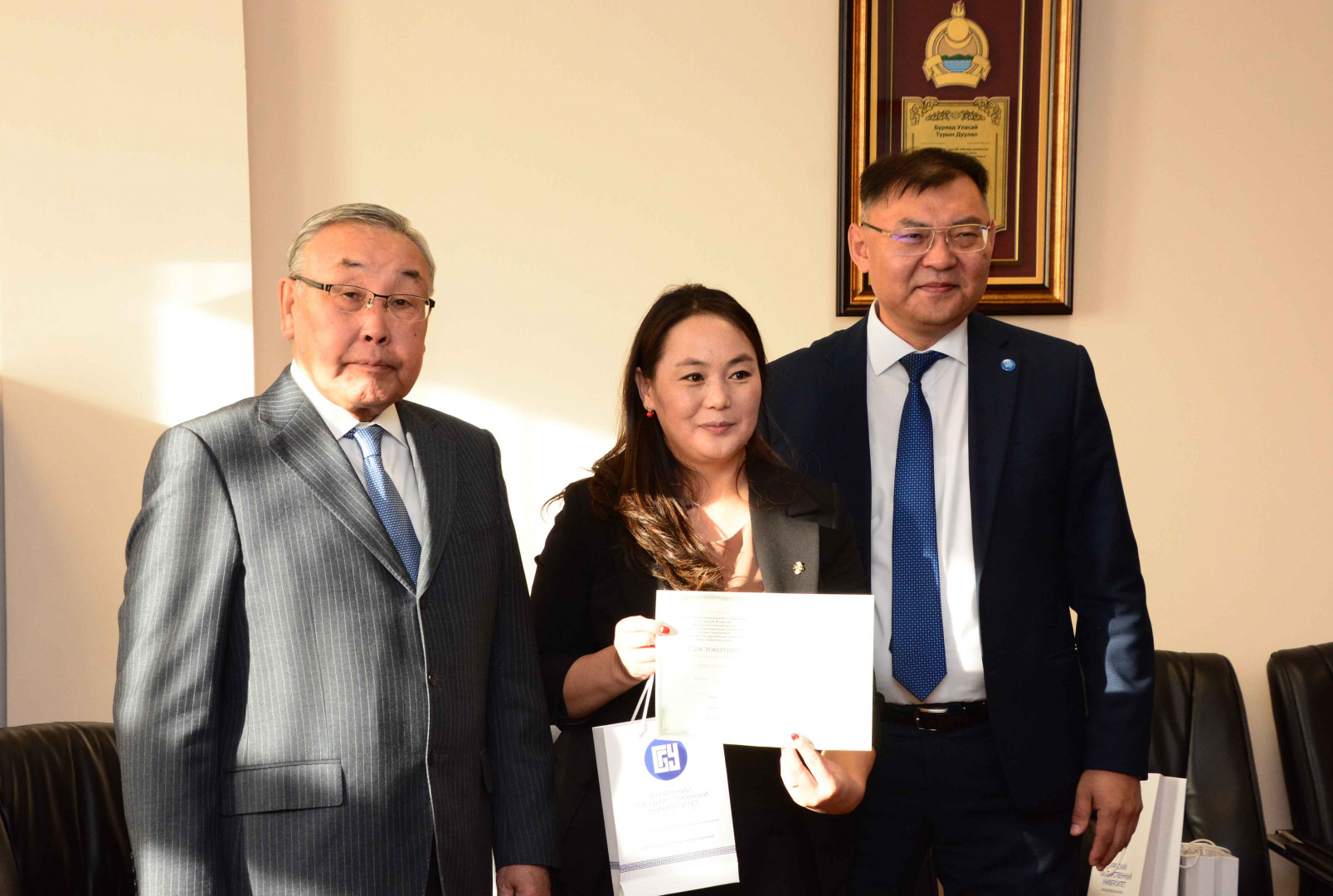По завершении встречи с монгольской делегацией были вручены удостоверения о прохождении курсов повышения квалификации "Теоретико-методологические аспекты внедрения комплекса ГТО в Монголии".
