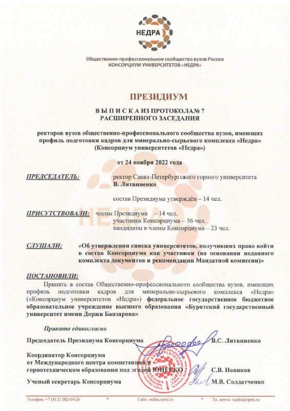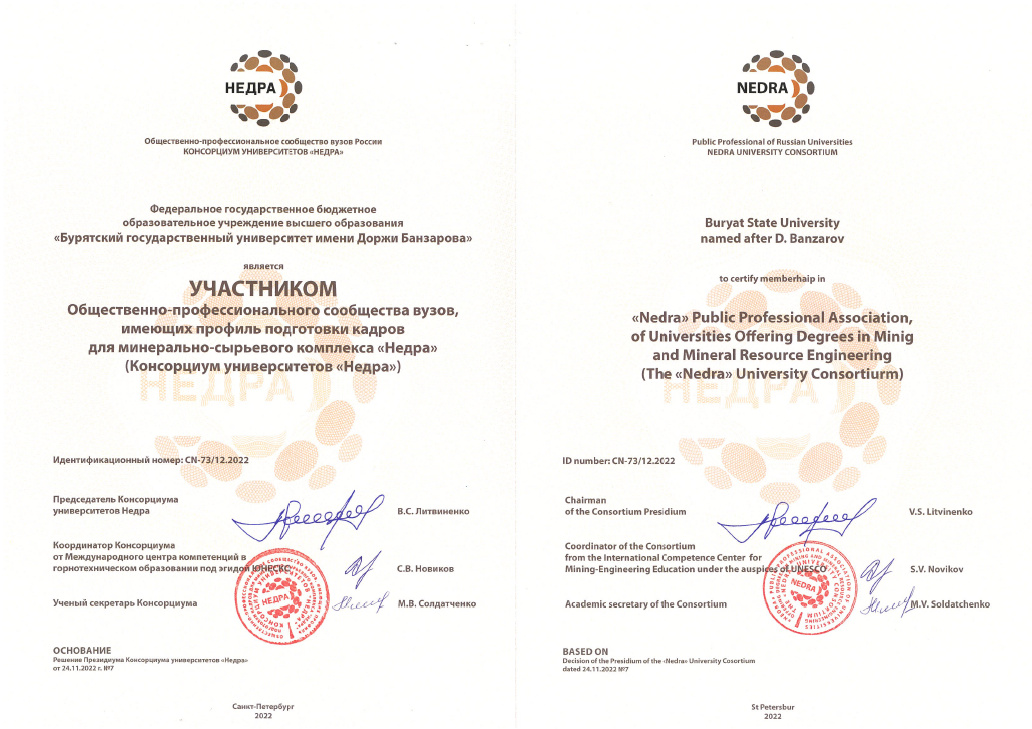 24 ноября 2022 года Общественно-профессиональное сообщество России КОНСОРЦИУМ УНИВЕРСИТЕТОВ «НЕДРА» провело расширенное заседание, на котором постановили принять в состав комплекса «Недра» ФГБОУ ВО Бурятский государственный университет им. Доржи Банзарова. От нашего университета в данном проекте участвует кафедра Геологии Химического факультета.