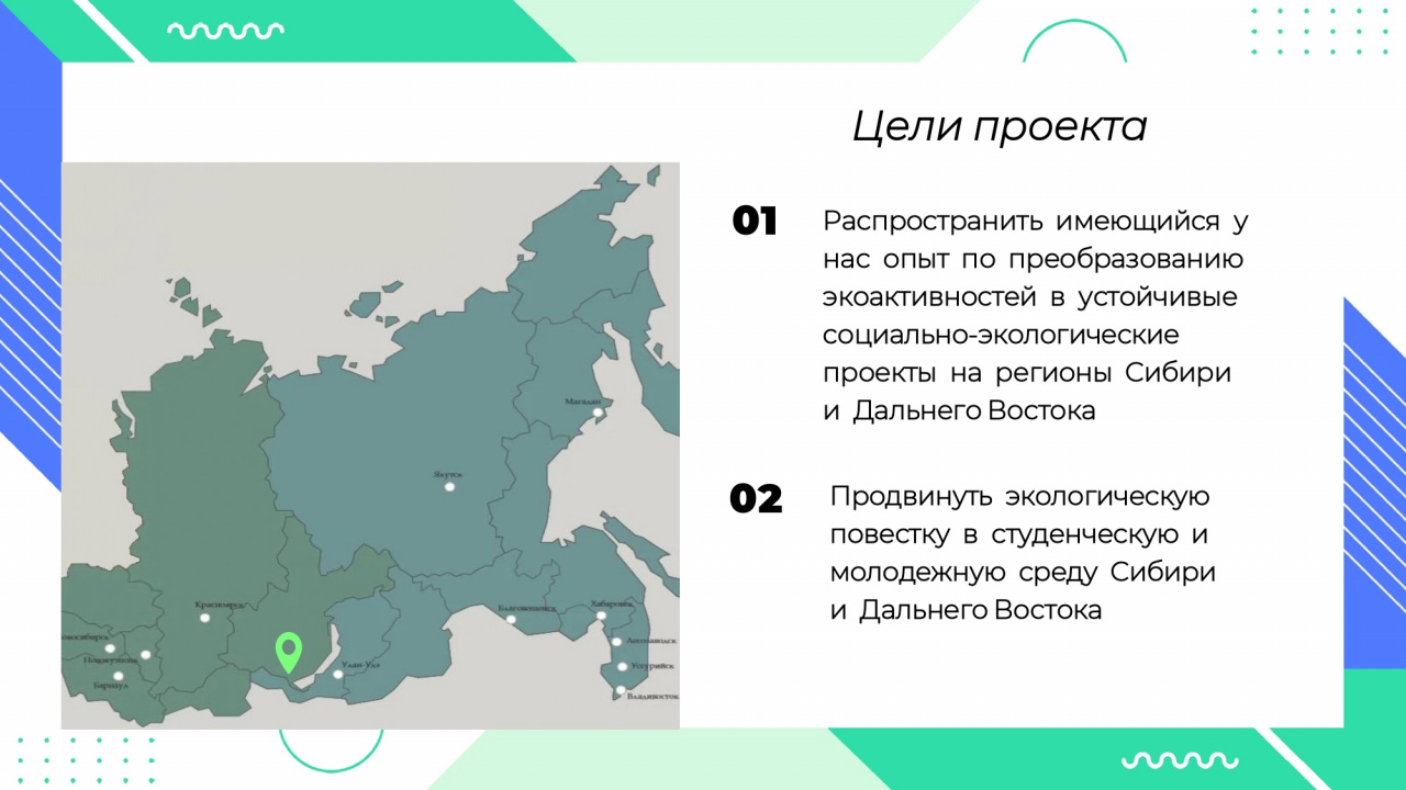 Проект направлен на распространение имеющегося опыта по преобразованию эко-активностей в устойчивые социально-экологические проекты на регионы Сибири и Дальнего Востока и продвижение экологической повестки в студенческую и молодежную среду. Проект выполняется с февраля 2023 года по апрель 2024 года при поддержке Фонда президентских грантов.