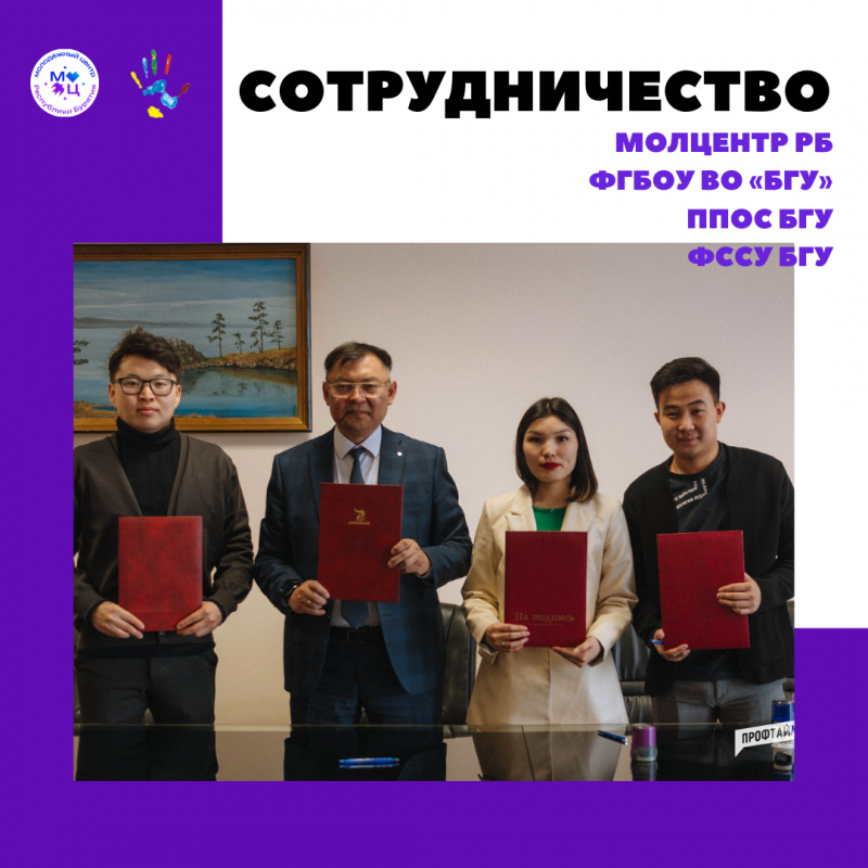 По итогу встречи ректор БГУ им. Доржи Банзарова - Дамдинов Алдар Валерьевич, председатель ППОС БГУ - Балданова Дарима и председатель ФССУ БГУ - Машеев Сергей подписали четырехстороннее соглашение о сотрудничестве с руководителем ГАУ РБ «Молодежный центр» - Санжиевым Замбалой Владимировичем.