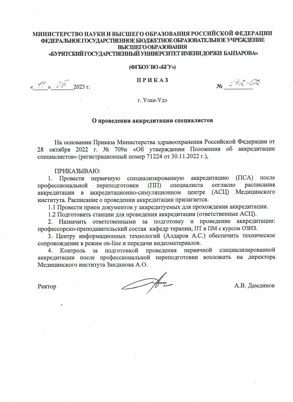 Аккредитация специалистов проводится на основании Приказа Министерства здравоохранения Российской Федерации от 28 октября 2022 г. № 709н «Об утверждении Положения об аккредитации специалистов» (регистрационный номер 71224 от 30.11.2022 г.).