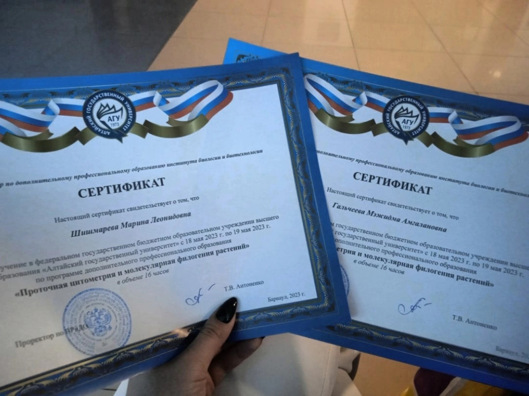 Также 18-19 мая на базе ФГБОУ ВО "Алтайский государственный университет" прошла IV Всероссийская научно-практическая школа молодых учёных "Проточная цитометрия и молекулярная филогения растений" в городе Барнаул с выдачей удостоверений о дополнительном профессиональном образовании (при условии, что имеется высшее образование) или сертификатов о пройденном обучении. И студенты ФБГиЗ БГУ приняли в школе активное участие: Шишмарева Марина, гр.01100; Гальчеева Мэжидма, гр. 01110.