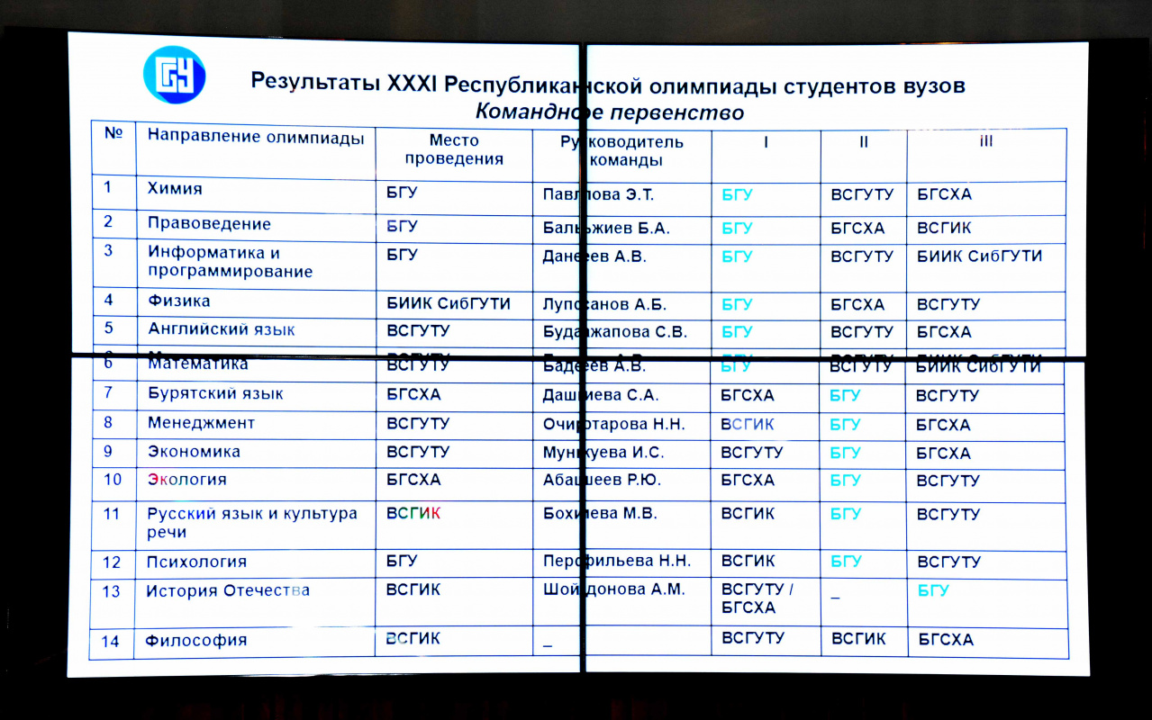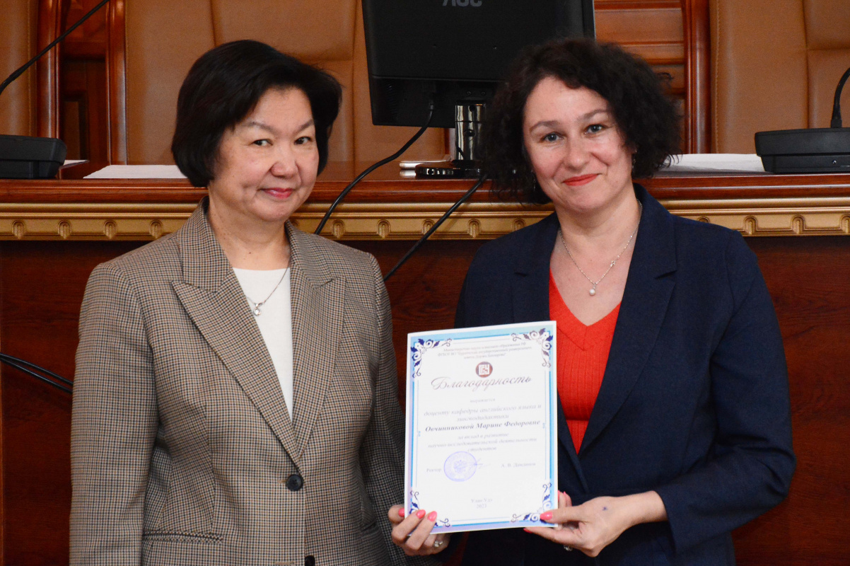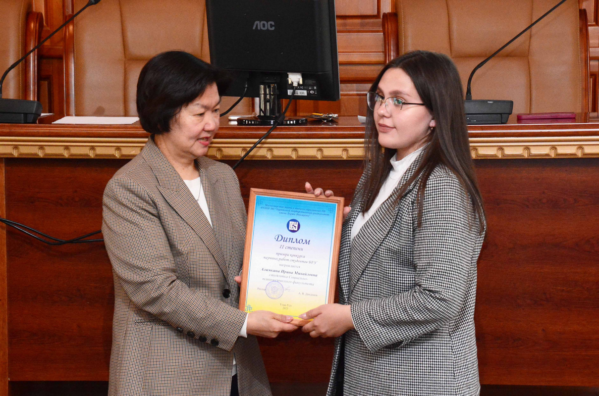 Студентам победителям и призерам международных и всероссийских мероприятий за 2022-2023 учебный год вручены грамоты за успехи в научной деятельности и подарочные сертификаты. Благодарственными письмами Министерства образования и науки Республики Бурятия награждены организаторы и руководители студентов – победителей XXXI республиканской олимпиады студентов образовательных организаций высшего образования. Благодарностями ректора были отмечены научные руководители студентов – победителей и призеров международных и всероссийских мероприятий.