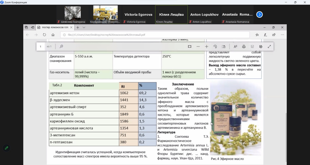 Недавно были подведены итоги постерных докладов (в дистанционном формате) Международной научной конференции студентов, аспирантов и молодых учёных «Ломоносов-2023», которая проходила на базе МГУ имени М.В. Ломоносова. Студенты специальности "Фармация" медицинского института приняли участие в работе секции "Химия живых систем, нанобиометриалы и биотехнологии", в период с 12 по 21 апреля 2023 года. По результатам работы секции студенты 4 курса, гр. 14291 Лещева Ю.Н. и Шевелева Е.С. были награждены грамотой 2 и 3 степени, соответственно. Научный руководитель - к.фарм.н., доцент Рандалова Т.Э.
