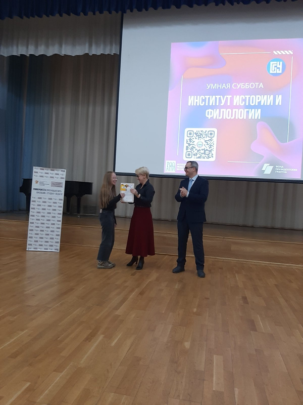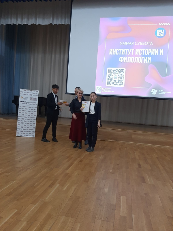 На открытии профориентационного мероприятия "Умная суббота" ИО министра образования и науки РБ Н. Ю. Сандакова и директор ИИФ БГУ Н.С. Байкалов поздравили старшеклассников школ и студентов колледжей с одержанной победой в конкурсе сочинений "Духовно-нравственный потенциал русской литературы".