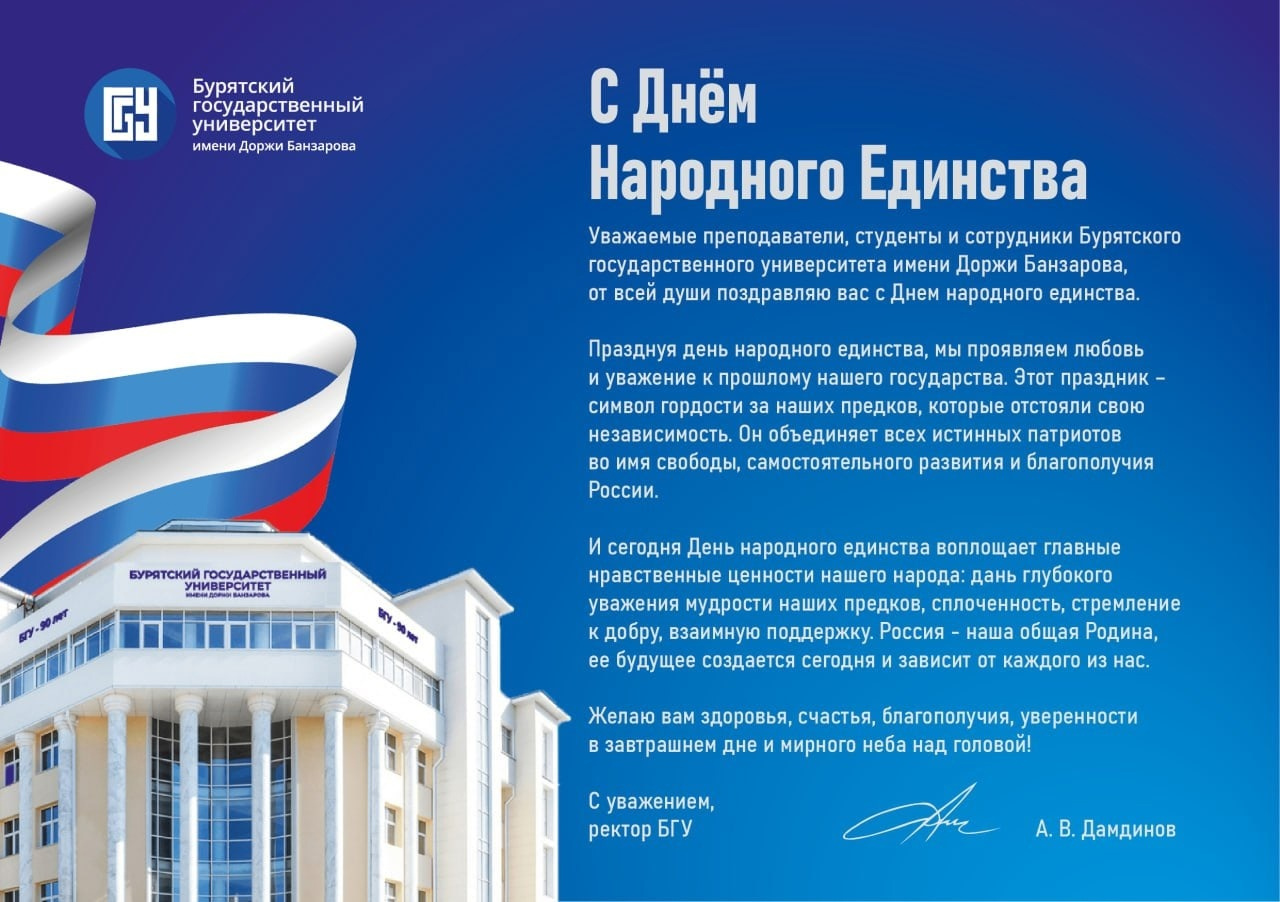 Уважаемые преподаватели, студенты и сотрудники Бурятского государственного университета имени Доржи Банзарова, от всей души поздравляю вас с Днем народного единства.