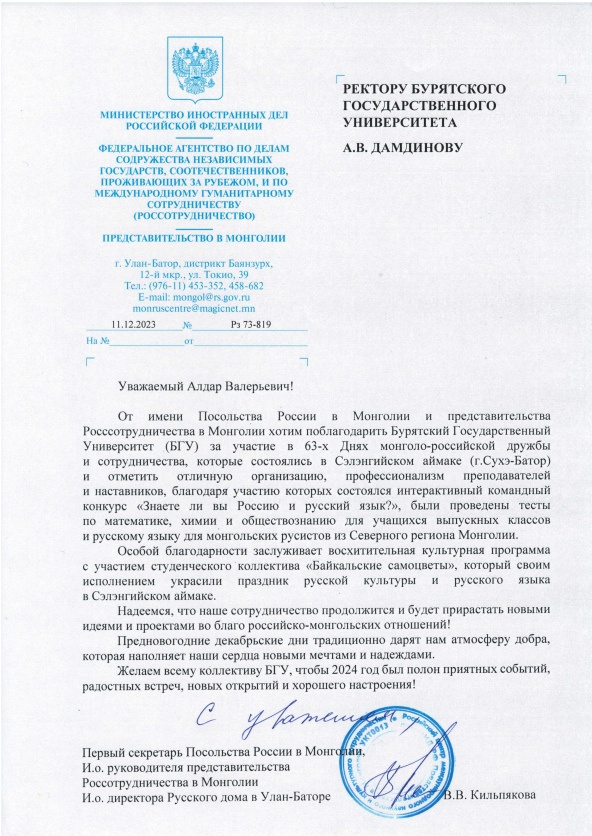 От имени Посольства России в Монголии и представительства Россотрудничества в Монголии хотим поблагодарить Бурятский Государственный Университет (БГУ) за участие в 63-х Днях монголо-российской дружбы и сотрудничества, которые состоялись в Сэлэнгийском аймаке (г.Сухэ-Батор) и отметить отличную организацию, профессионализм преподавателей и наставников, благодаря участию которых состоялся интерактивный командный конкурс "Знаете ли вы Россию и русский язык?", были проведены тесты по математике, химии и обществознанию для учащихся выпускных классов и русскому языку для монгольских русистов из Северного региона Монголии.