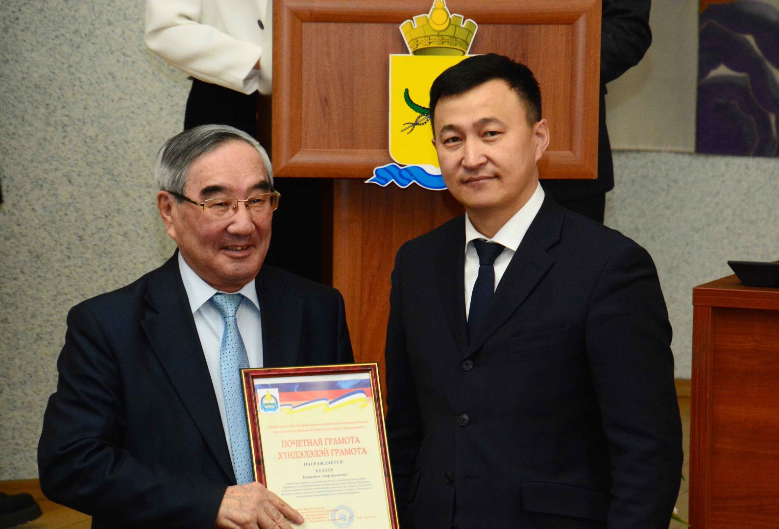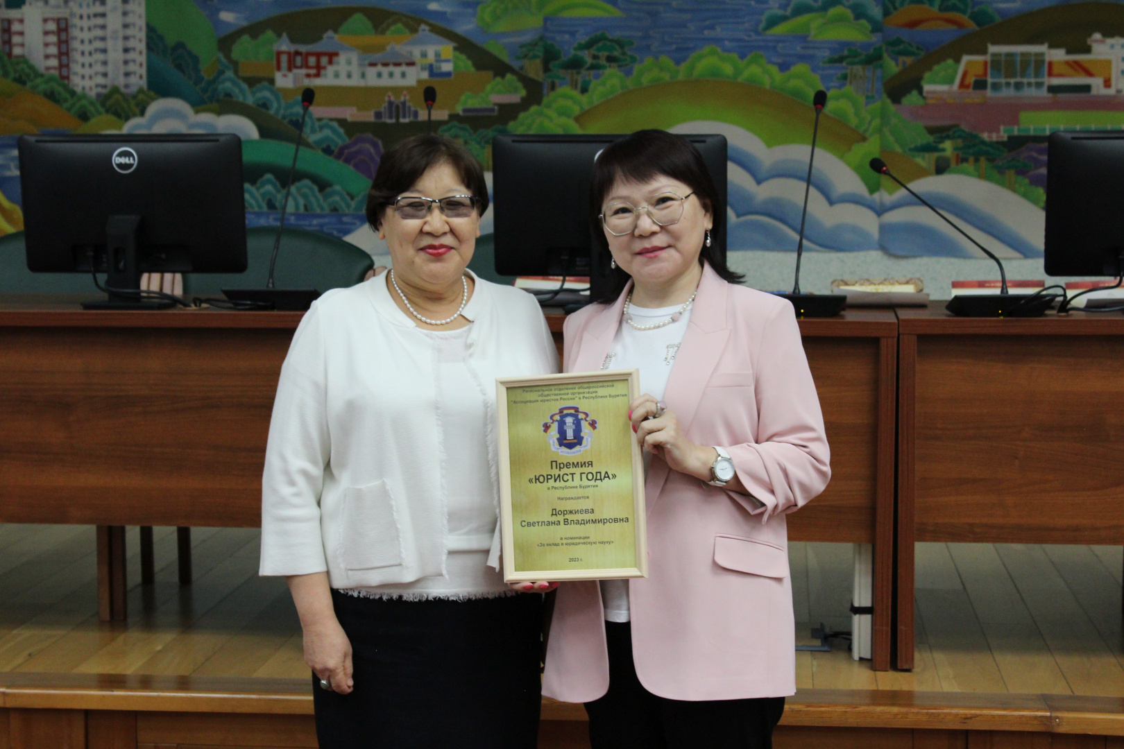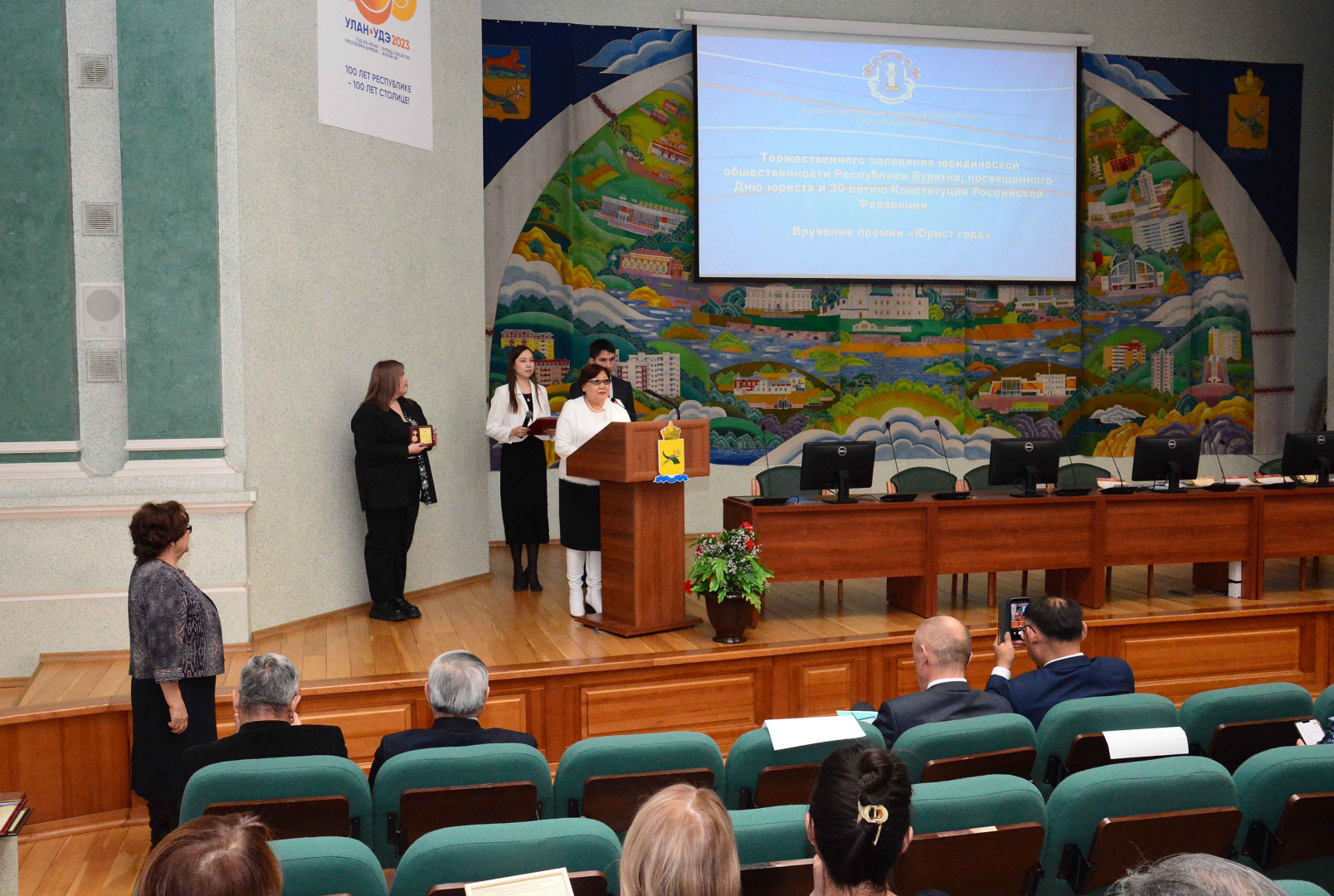 На торжественном собрании выступили и вручили премии «Юрист года Республики Бурятия» Заместитель полномочного представителя Президента Российской Федерации в Дальневосточном федеральном округе Куранов Григорий Владимирович, Руководитель Администрации Главы Республики Бурятия и Правительства Республики Бурятия Алдар Цыденжабович Гулгенов, Председатель Комитета Народного Хурала Республики Бурятия по государственному устройству, местному самоуправлению, законности и вопросам государственной службы Мордовской Петр Степанович, ректор Бурятского государственного университета имени Доржи Банзарова Дамдинов Алдар Валерьевич, Председатель Верховного Суда Республики Бурятия Кириллова Альбина Александровна, Начальник Управления Минюста России по Республике Бурятия Баранакова Маргарита Владимировна, Председатель Государственно-правового комитета Администрации Главы и Правительства Республики Бурятия Халтакшинова Валерия Васильевна.