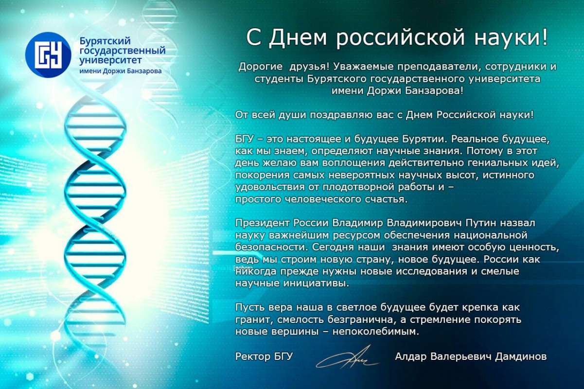БГУ – это настоящее и будущее Бурятии. Реальное будущее, как мы знаем, определяют научные знания. Потому в этот день желаю вам воплощения действительно гениальных идей, покорения самых невероятных научных высот, истинного удовольствия от плодотворной работы и – простого человеческого счастья.
