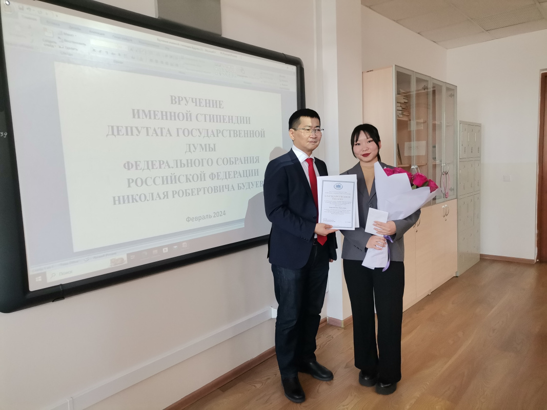 По итогам зимней сессии 2023-2024 учебного года стипендии удостоена студентка 3 курса ИИФ Сэсэг Рабжаева (03915 гр.). Сэсэг отличается активной жизненной позицией, успешно занимается общественной деятельностью, является постоянным организатором и участником проводимых в университете мероприятий по продвижению и развитию бурятского языка.