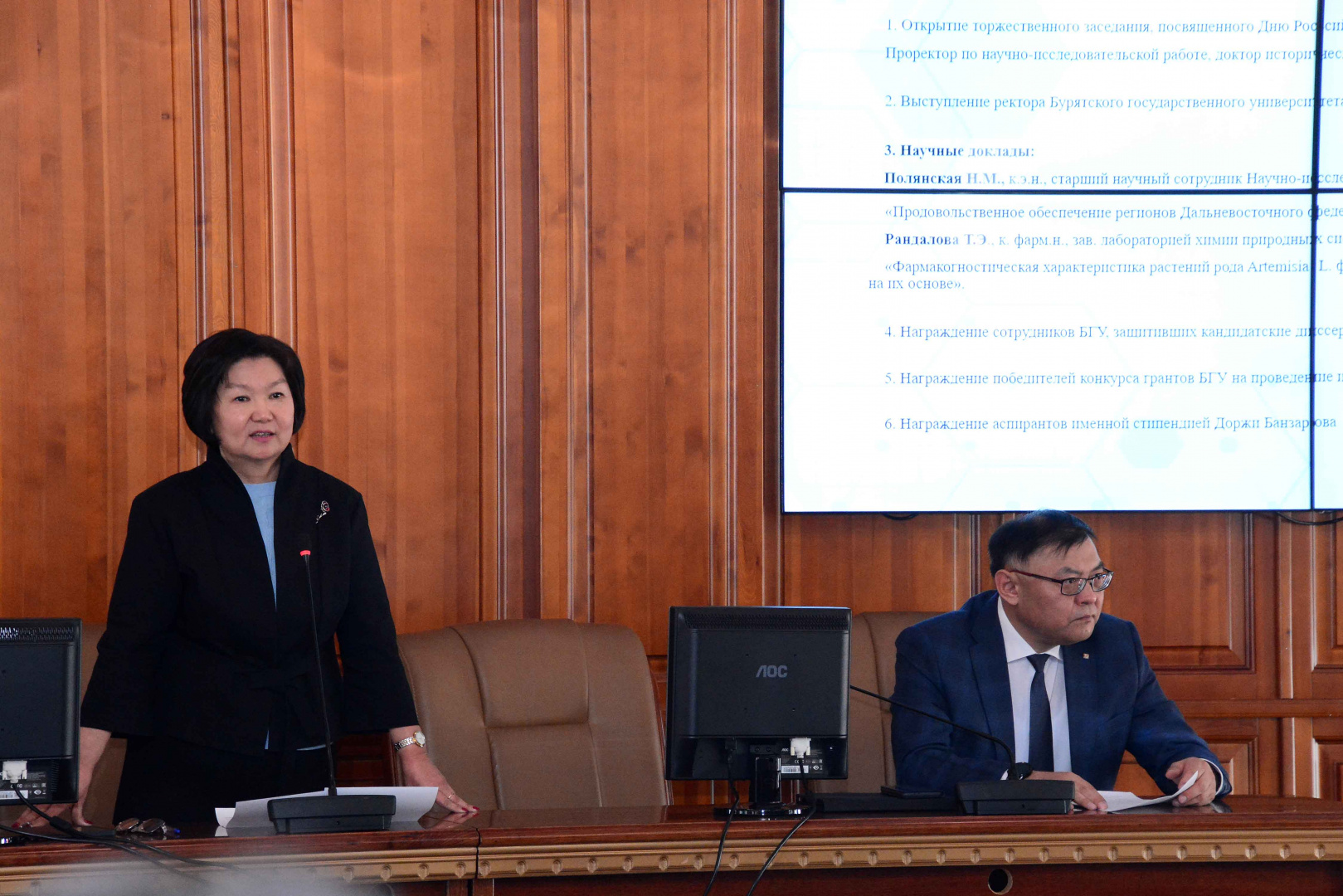 8 февраля в зале заседаний Учёного совета состоялось торжественное заседание, посвящённое Дню российской науки. С приветственным словом к коллегам обратилась проректор по научно-исследовательской работе университета Номогоева Виктория Владимировна, которая поздравила сотрудников университета с Днём науки и отметила основные научные достижения университета. Ректор БГУ Дамдинов Алдар Валерьевич, поздравив коллег с профессиональным праздником, в своем выступлении подчеркнул высокую значимость науки для развития государства.