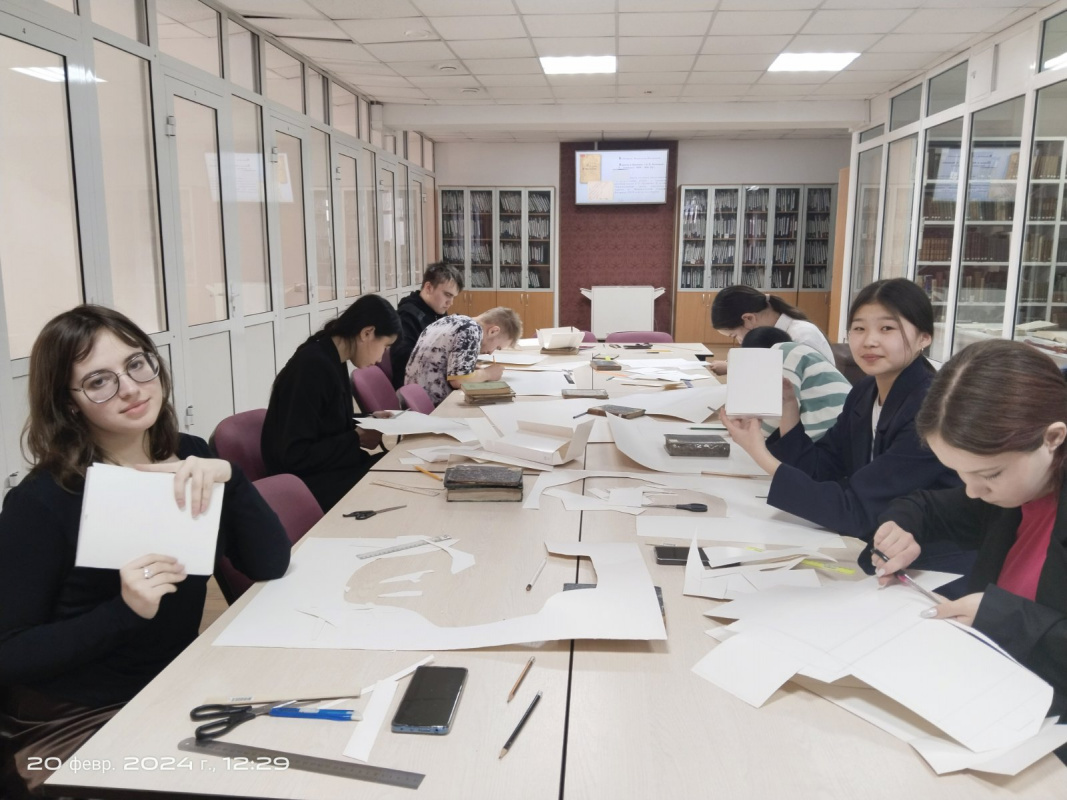 Под руководством А. В. Ильиной ребятам надо было сделать «выкройки» по индивидуальным размерам книг, используя карандаш, линейку и ножницы. Затем вырезать детали из картона, сделать сгибы по разметкам и получить готовое изделие. Казалось бы, ничего сложного, но всем пришлось постараться, чтобы освоить технику изготовления «коробочек». Такие контейнеры для хранения редких изданий могут прослужить более 1000 лет, они не желтеют и не разрушаются.