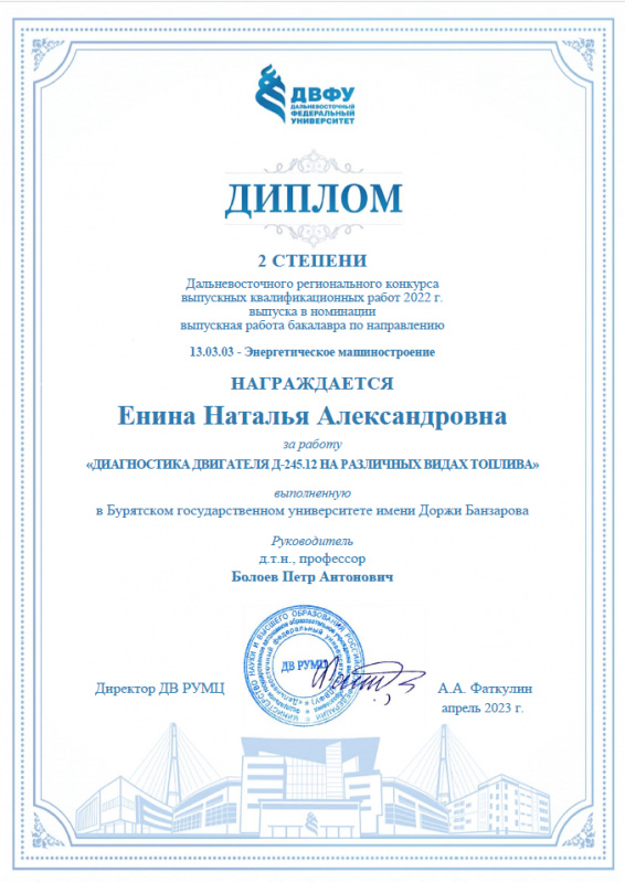 В конкурсе приняла участие выпускница 2022 года по направлению 13.03.03 Энергетическое машиностроение Енина Наталья Александровна (научный руководитель - Болоев Петр Антонович, д.т.н., профессор). На конкурс была отправлена дипломная работа на тему "Диагностика двигателя Д-245.12 на различных видах топлива".