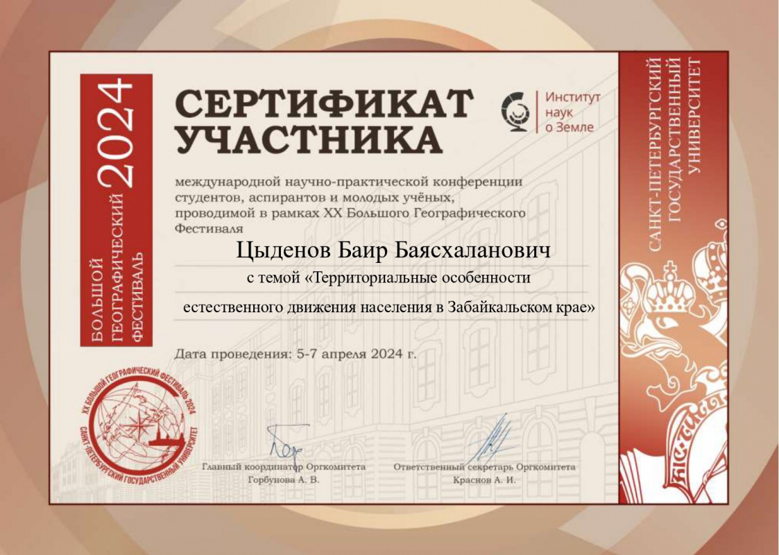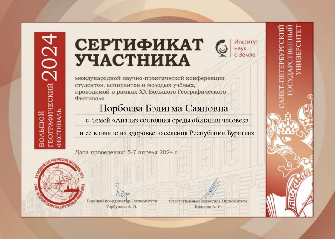 Аспиранты 3 года обучения Баир Цыденов направления подготовки 05.06.01 Науки о земле профиля подготовки Экономическая, социальная, политическая и рекреационная география» и Бэлигма Норбоева «Геоэкология» выступили с научными докладами на Международной научно-практической конференции студентов, аспирантов и молодых ученых, которая проходила в рамках фестиваля.