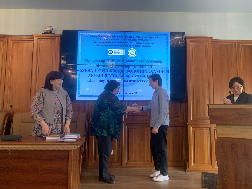 Кроме того специальным призом была награжден доклад магистранта 2 курса Ешисамбуева Димчика, студента группы 03522м, на тему «Ц. Ц. Цыдыпов – багша, сэрэгшэ, эрдэмтэн».