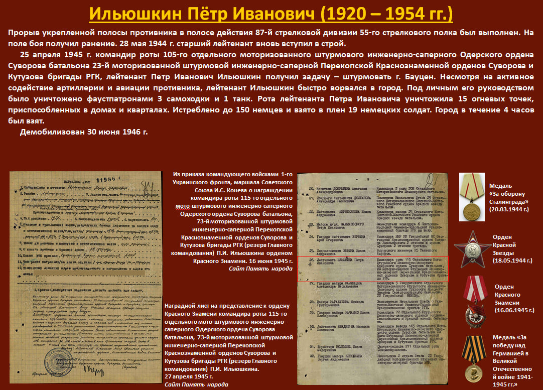 25 апреля 1945 г. командир роты 105-го отдельного моторизованного штурмового инженерно-саперного Одерского ордена Суворова батальона 23-й моторизованной штурмовой инженерно-саперной Перекопской Краснознаменной орденов Суворова и Кутузова бригады РГК, лейтенант Петр Иванович Ильюшкин получил задачу – штурмовать г. Бауцен. Несмотря на активное содействие артиллерии и авиации противника, лейтенант Ильюшкин быстро ворвался в город.