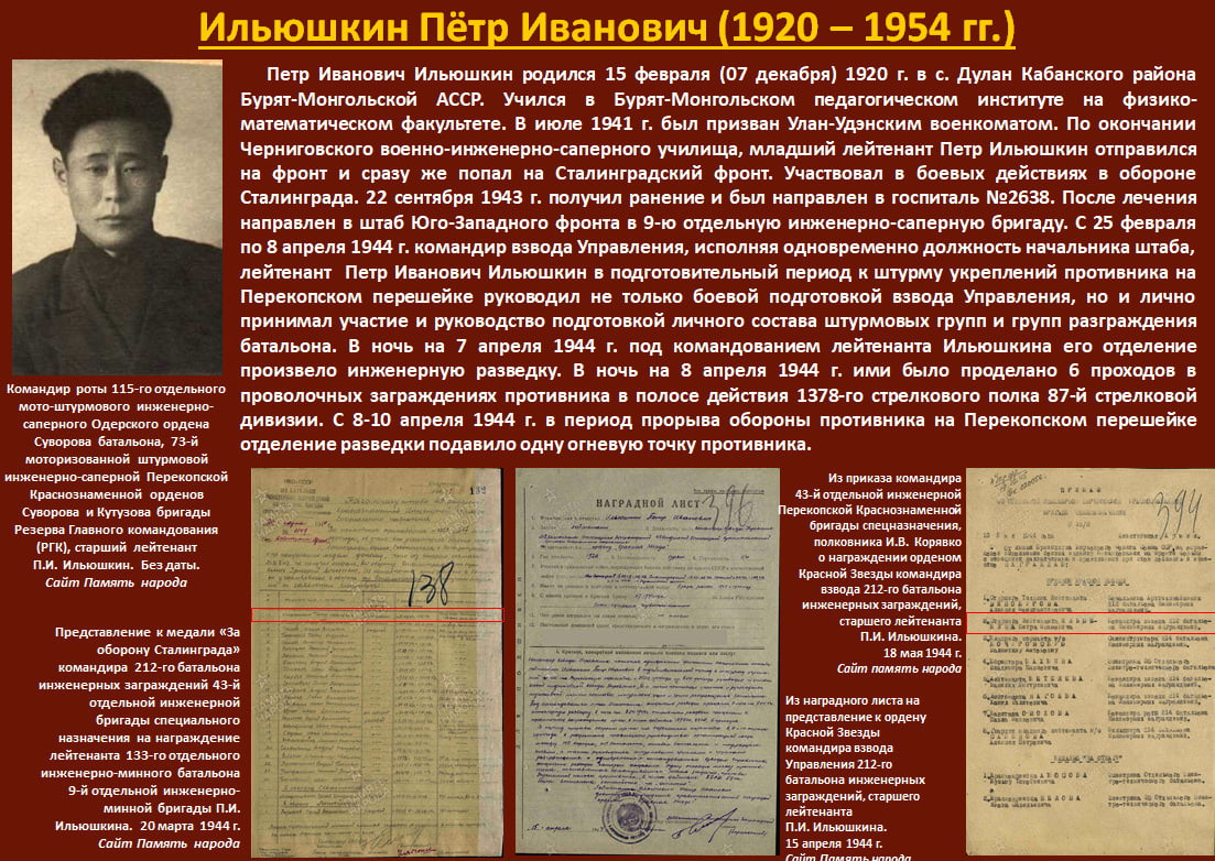 С 25 февраля по 8 апреля 1944 г. командир взвода Управления, исполняя одновременно должность начальника штаба, лейтенант Петр Иванович Ильюшкин в подготовительный период к штурму укреплений противника на Перекопском перешейке руководил не только боевой подготовкой взвода Управления, но и лично принимал участие и руководство подготовкой личного состава штурмовых групп и групп разграждения батальона.