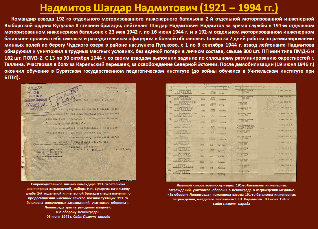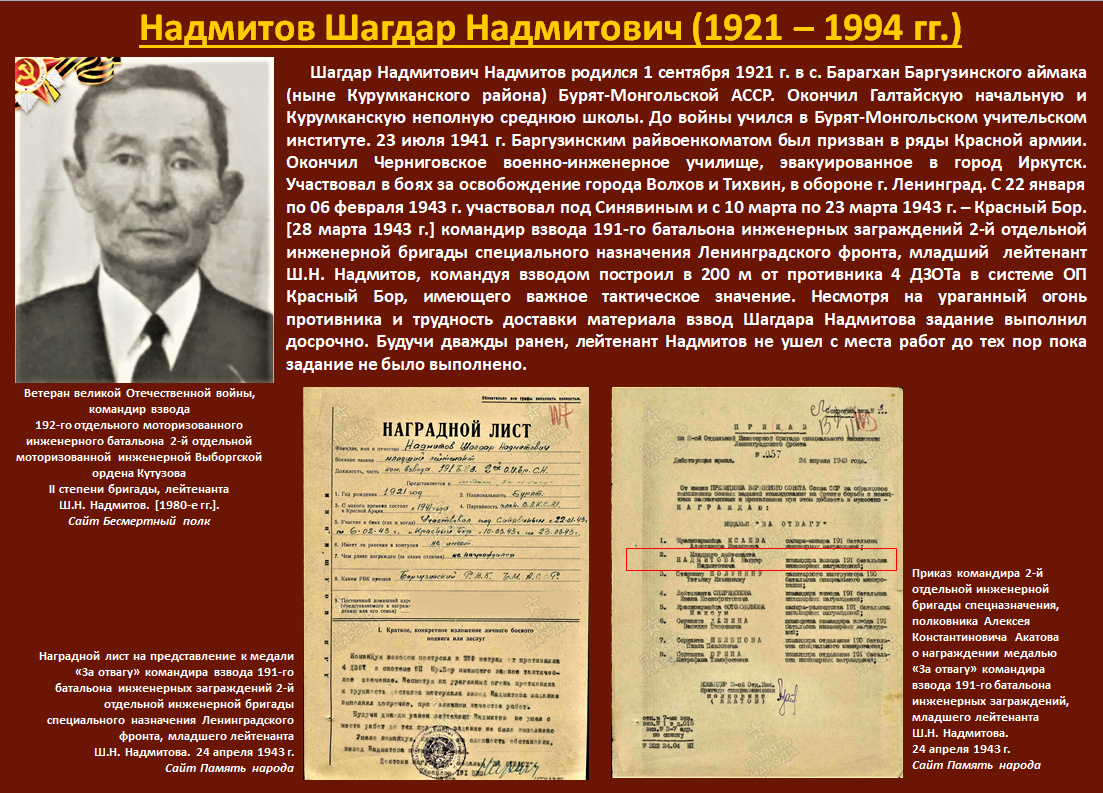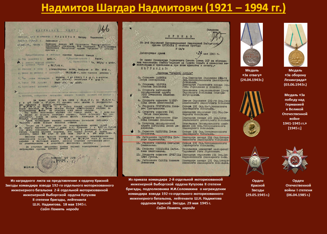 [28 марта 1943 г.] командир взвода 191-го батальона инженерных заграждений 2-й отдельной инженерной бригады специального назначения Ленинградского фронта, младший лейтенант Ш.Н. Надмитов, командуя взводом построил в 200 м от противника 4 ДЗОТа в системе ОП Красный Бор, имеющего важное тактическое значение. Несмотря на ураганный огонь противника и трудность доставки материала взвод Шагдара Надмитова задание выполнил досрочно. Будучи дважды ранен, лейтенант Надмитов не ушел с места работ до тех пор пока задание не было выполнено.