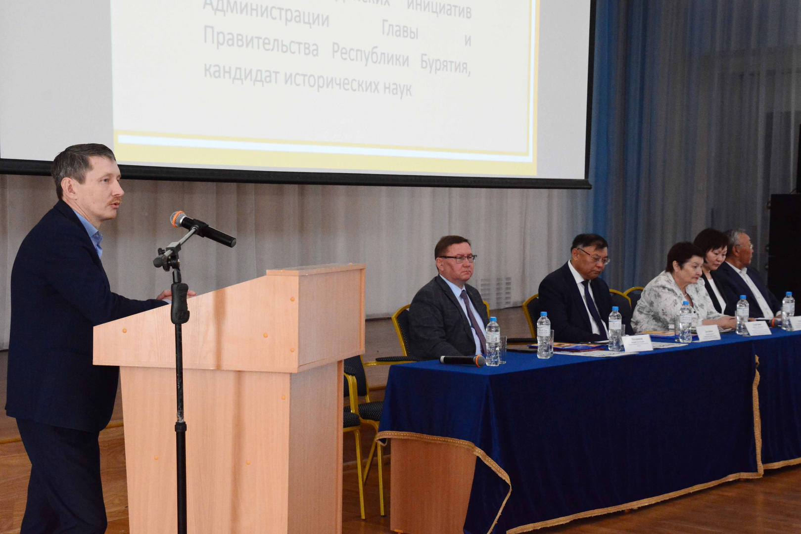 Торжественное собрание общественности открыл ректор университета, кандидат исторических наук Алдар Валерьевич Дамдинов, с приветственными словами в адрес юбиляра и его заслуг обратились: министр образования и науки Республики Бурятия Валерий Анатольевич Поздняков, председатель комитета по межнациональным отношениям и развитию гражданских инициатив Администрации Главы и Правительства Республики Бурятия Михаил Александрович Харитонов, профессор кафедры теории физической культуры БГУ, доктор педагогических наук, профессор, член-корреспондент РАО Степан Владимирович Калмыков, глава МО «Баргузинский район» Михаил Александрович Мишурин, заместитель директора по научно-методической работе «Баргузинская СОШ» Любовь Михайловна Жалсанова, профессор кафедры русской и зарубежной литературы БГУ, доктор филологических наук, профессор Татьяна Владимировна Затеева, профессор кафедры философии БГУ, доктор философских наук, профессор Иван Иосифович Осинский.