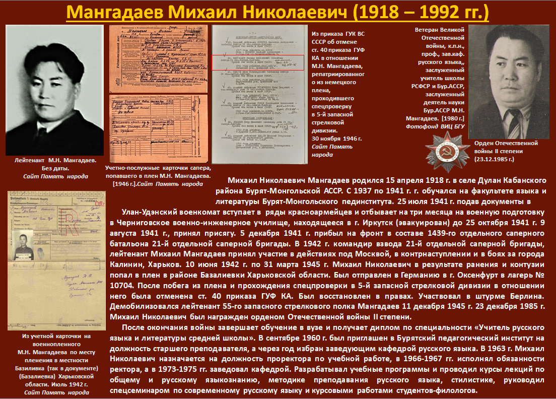 Михаил Николаевич Мангадаев родился 15 апреля 1918 г. в селе Дулан Кабанского района Бурят-Монгольской АССР.