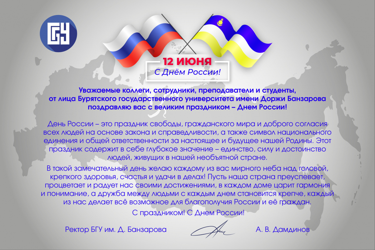 Уважаемые коллеги, сотрудники, преподаватели и студенты, от лица Бурятского государственного университета имени Доржи Банзарова поздравляю вас с великим праздником - Днем России!