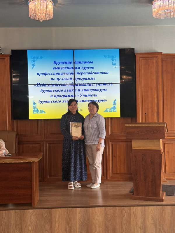 25 июня 2024 г. в Высшей школе бурятского языка и литературы состоялась церемония вручения дипломов выпускникам курсов профессиональной переподготовки по целевой программе «Педагогическое образование: учитель бурятского языка и литературы» и программе «Учитель бурятского языка и литературы».