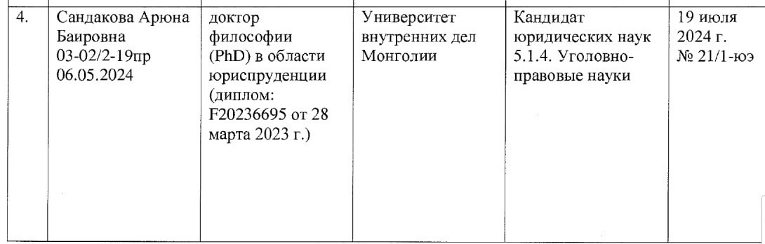 Напомним, что в 2019 г. А.Б. Сандакова окончила аспирантуру нашего университета. 28 марта 2023 г. защитила диссертацию в Университете внутренних дел Монголии на тему: «Тактика использования следователем правовых норм о компромиссах по делам о дорожно-транспортных преступлениях (по материалам Российской Федерации)» под научным руководством д.ю.н., профессора Юрия Петровича Гармаева и д.ю.н., доцента Елены Ильиничны Поповой.