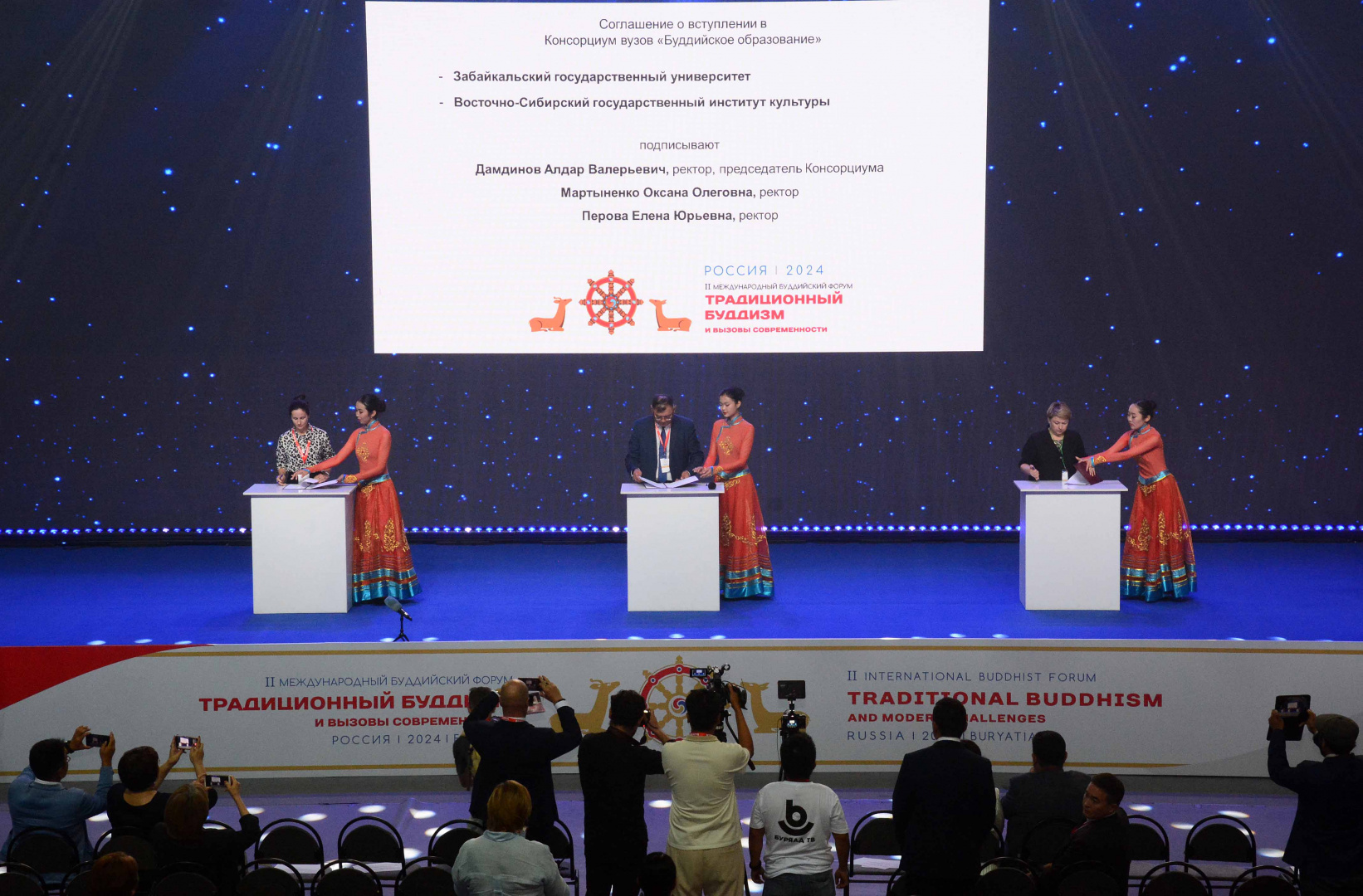 Председатель Консорциума вузов «Буддийское образование», ректор Бурятского государственного университета имени Доржи Банзарова А. В. Дамдинов объявил о подписании соглашения, в котором приняли участие ректор Забайкальского государственного университета О. О. Мартыненко (г. Чита) и ректор Восточно-Сибирского института культуры (г. Улан-Удэ) Е. Ю. Перова.