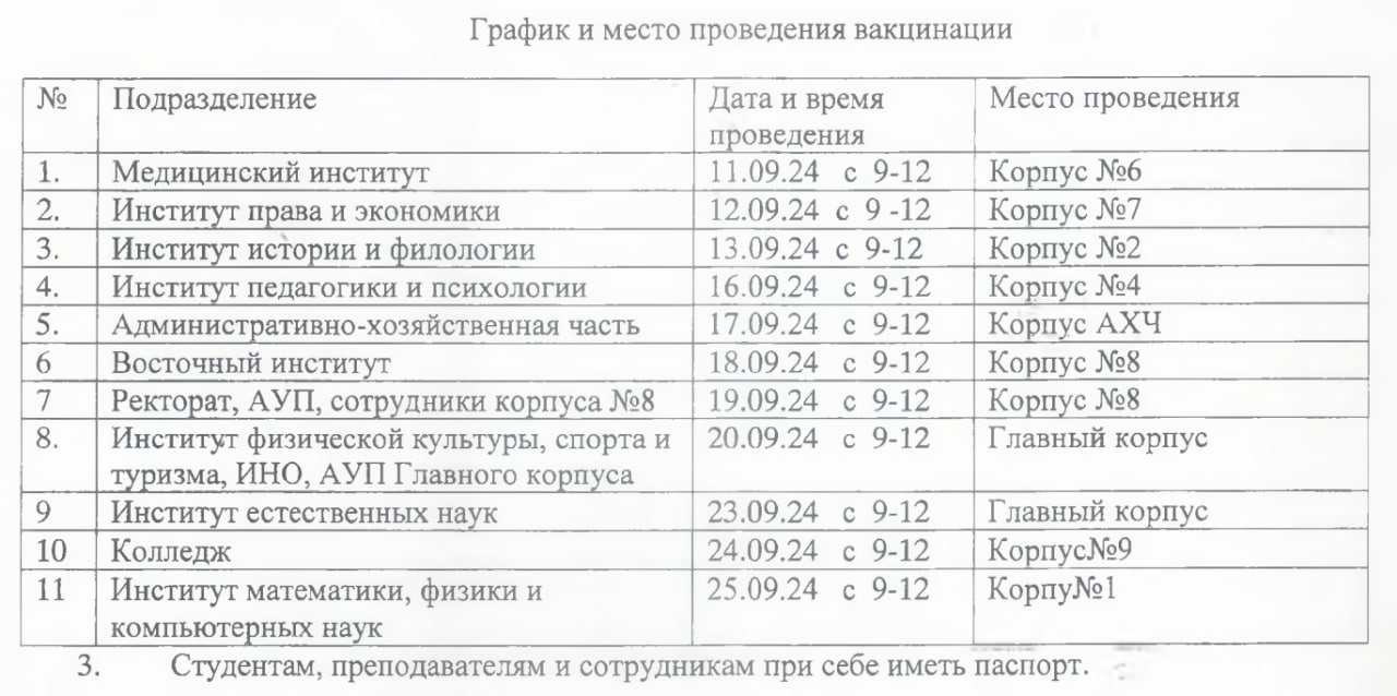1. Здравпункту университета организовать проведение вакцинации от гриппа студентов, сотрудников, преподавателей институтов и колледжа, административно-управленческого персонала в период с 11.09.2024 по 25.09.2024 г.