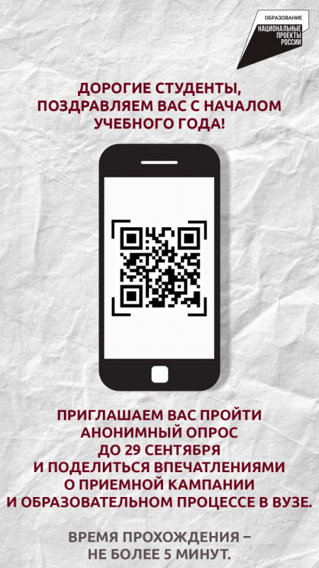 Приглашаем вас пройти анонимный опрос до 29 сентября и поделиться впечатлениями о приемной кампании и образовательном процессе в вузе.