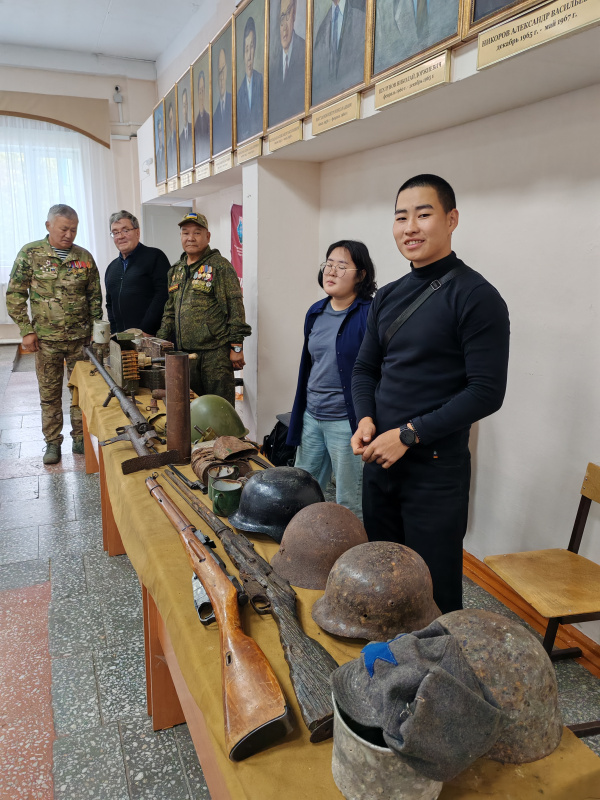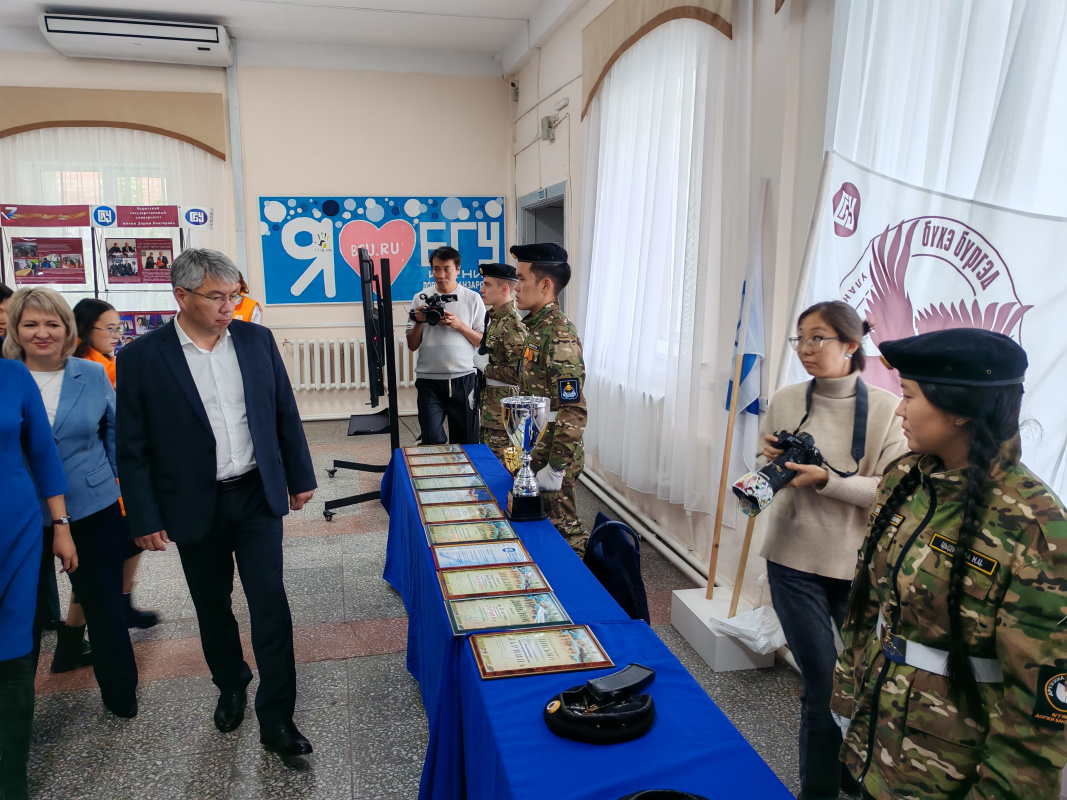 Перед началом торжественного мероприятия, в фойе актового зала были развернуты выставочные экспозиции, с которыми ознакомился Глава Республики Бурятия Алексей Самбуевич Цыденов. Здесь были представлены: выставка Визитно-информационного центра, посвященная помощи фронту БГПИ-БГУ в годы Великой Отечественной войны и Специальной военной операции; выставка-достижения спортивно-патриотического клуба "Бухэ Бургэд", выставка вооружения и обмундирования Центра допризывной подготовки; выставка предметов раскопок времен Великой Отечественной войны от РООД "Поисковое движение России" в Республике Бурятия; фотовыставка Фонда Защитников Отечества "Отец Героя", где была размещена фотография нашего выпускника (2009 г.) физико-технического факультета Пагбаева Александра Петровича (Отец Героя держит в руках портрет своего сына).