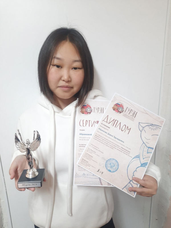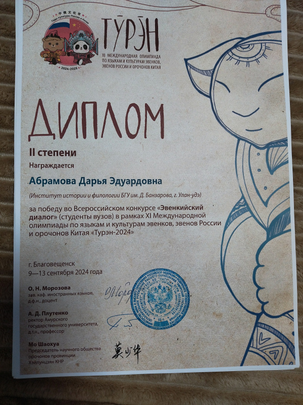 Абрамова Дарья, студентка Института истории и филологии, стала победителем Международной олимпиады по языку и культуре эвенков, эвенов России и орочонов Китая.