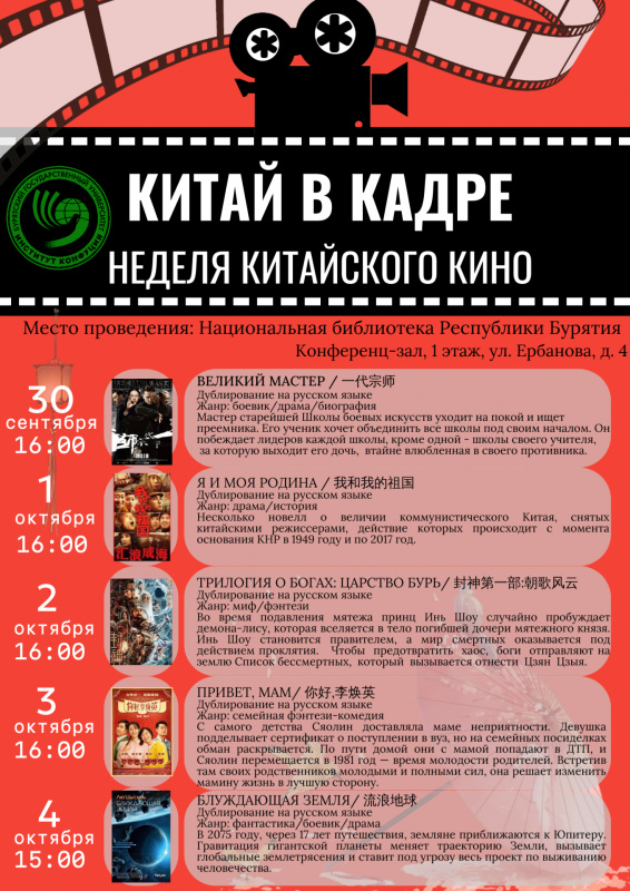 В честь 75-летия установления дипломатических отношений между Россией и Китаем Институт Конфуция БГУ приглашает на «Неделю китайского кино: Китай в кадре»!