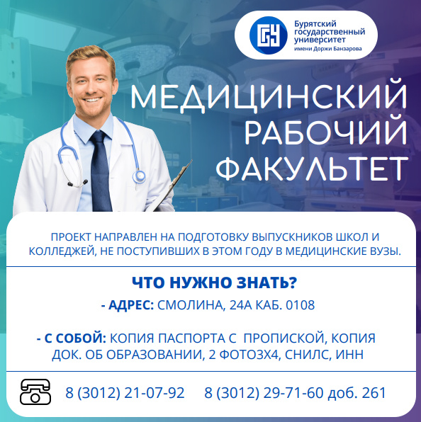 БГУ имени Доржи Банзарова совместно с Министерством здравоохранения Республики Бурятия и при поддержке Главы Республики Бурятия А.С. Цыденова объявляет набор на Медицинский рабфак.