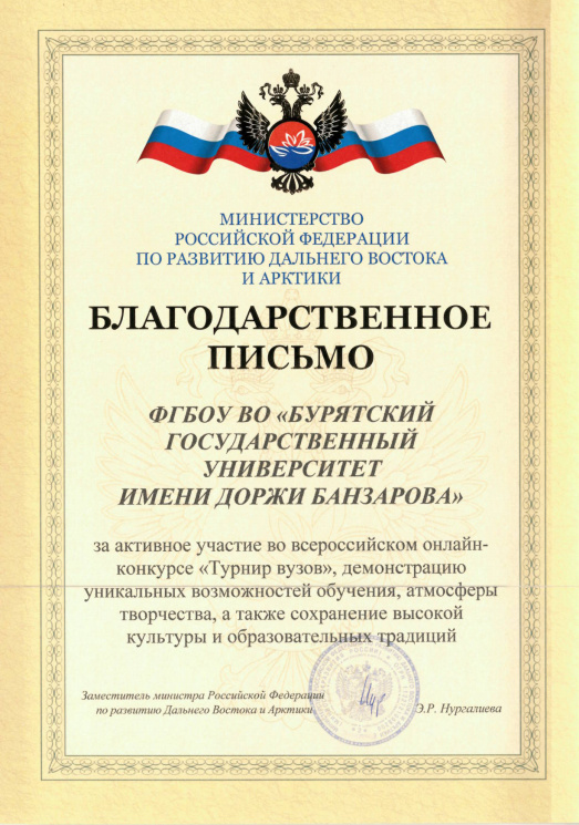 Бурятский государственный университет имени Доржи Банзарова награжден Благодарственным письмом от Министерства Российской Федерации по развитию Дальнего Востока за активное участие во всероссийском онлайн-конкурсе "Турнир вузов", демонстрацию уникальных возможностей обучения, атмосферы творчества, а также сохранение высокой культуры и образовательных традиций.