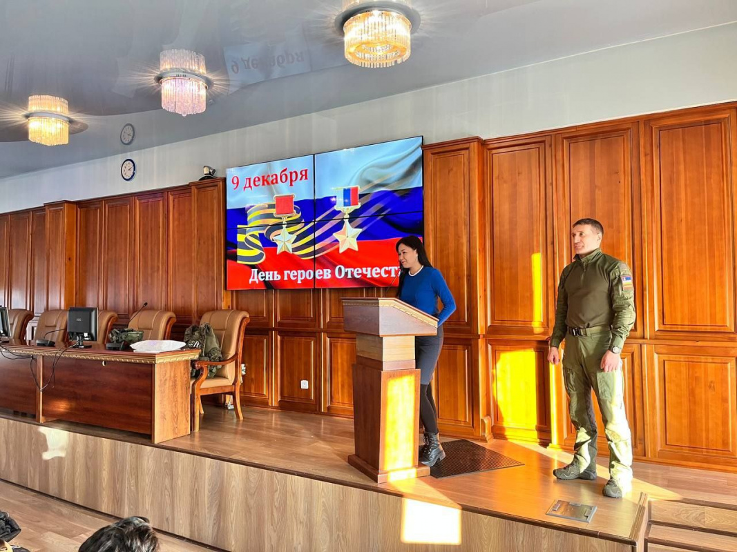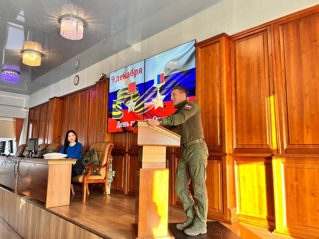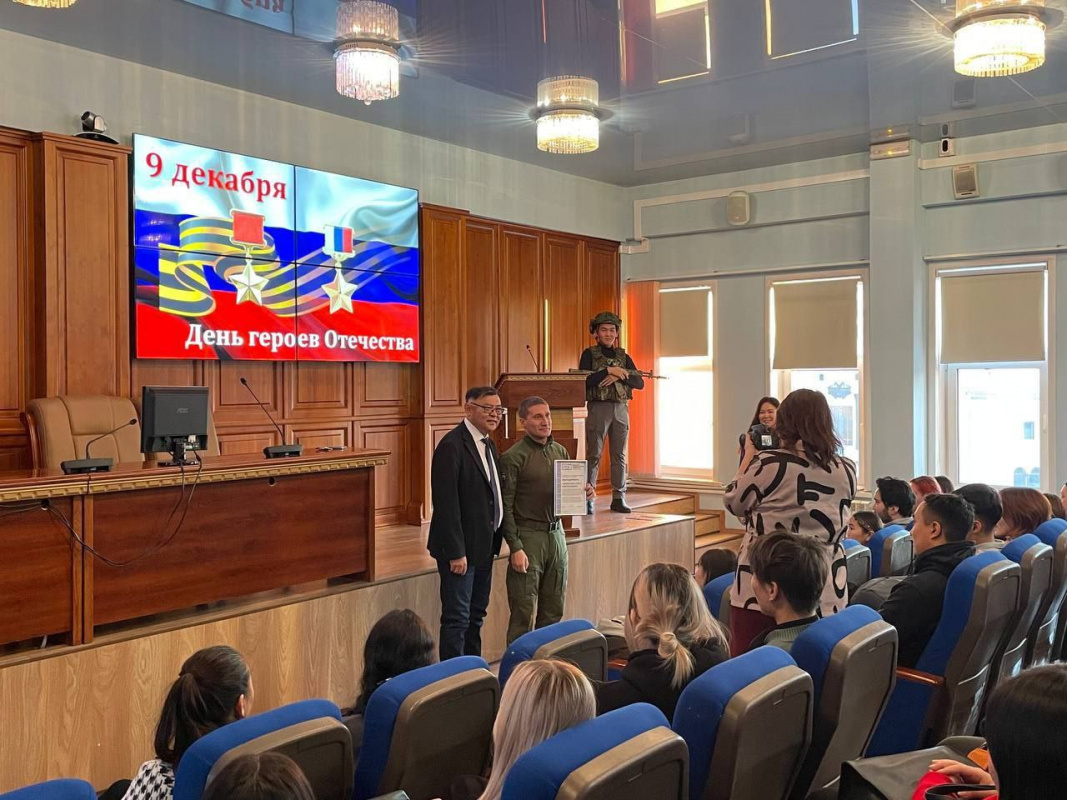 10 декабря 2024 г. в Зале Ученого совета состоялась встреча студентов институтов ИПЭ, ИМФКН, ИИФ, МИ, ВИ, ИФКСиТ и Колледжа с ветераном боевых действий в Северо-Кавказском регионе, участником Специальной военной операции с 2022 по 2024 гг., подполковником полиции, офицером Специального отряда быстрого реагирования «Барс» Управления Росгвардии по Республике Бурятия, кандидатом в мастера спорта, членом сборной команды Бурятии по гиревому спорту, кавалером ордена «За заслуги перед Отечеством» I и II степени, медали «За Отвагу» (позывной «Барсик»).