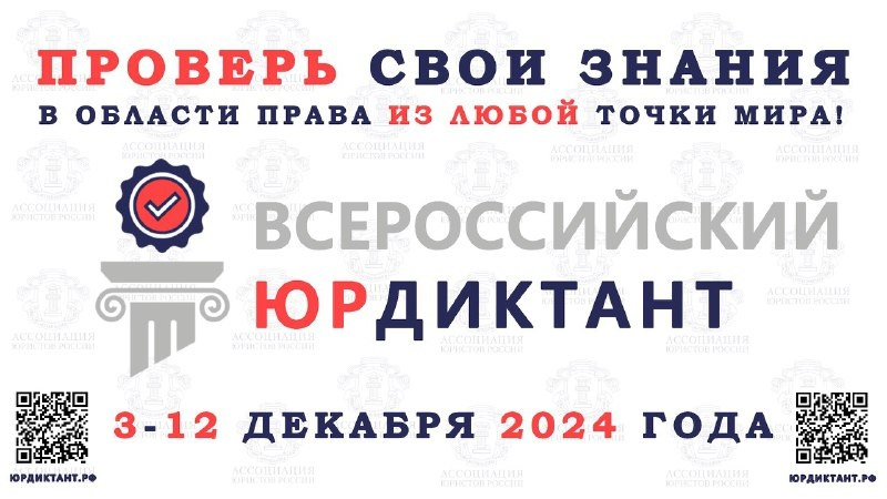 С 3 по 12 декабря 2024 года проводится VIII Всероссийский правовой (юридический) диктант. Диктант состоит из 33 тестовых вопросов, каждый вопрос имеет четыре варианта ответа, правильным из которых является только один.